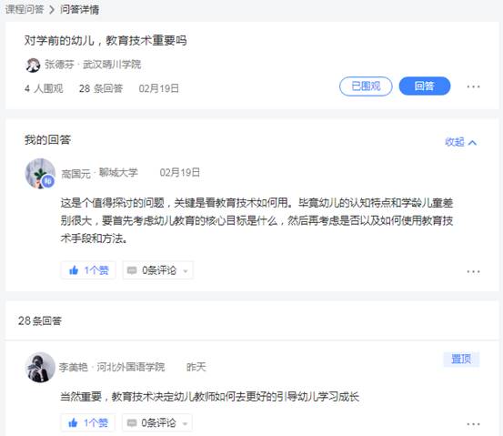 对于课程团队来说,面对每天增加的选课员工数据,首先要考虑的就是如何保障教学服务质量。“四千多名员工,既是一份信任,更是沉甸甸的责任,要勇于担当,守土有责”,高老师这样说,也带着团队这样做。根据不同公司的员工专业特点,在对员工辅导答疑时就要有的放矢,如武汉晴川公司的张德芬同学来自学前教育专业,她提出“对学前的幼儿,教育技术重要吗”的疑问,辅导老师就要引导员工思考幼儿的认知特点,并启发员工思考幼儿教育目标和技术应用的关系。