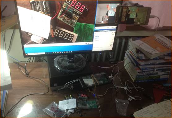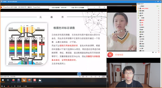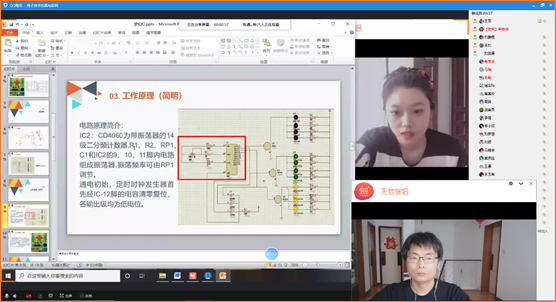 下图是王雨同学正在为全班同学远程分享“集成电路CD4060梦幻灯”的工作原理。