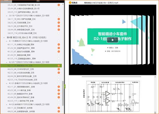 以下是员工分享的目录,打开的是王雨同学分享的“智能循迹小汽车”视频界面。