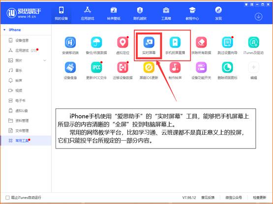 下图是“爱思助手”常用工具的“实时屏幕工具”界面。