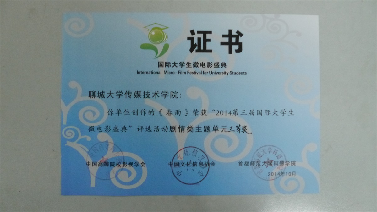 《春雨》荣获“2014第三届国际老员工微电影盛典”评选活动剧情类主题单元三等奖。