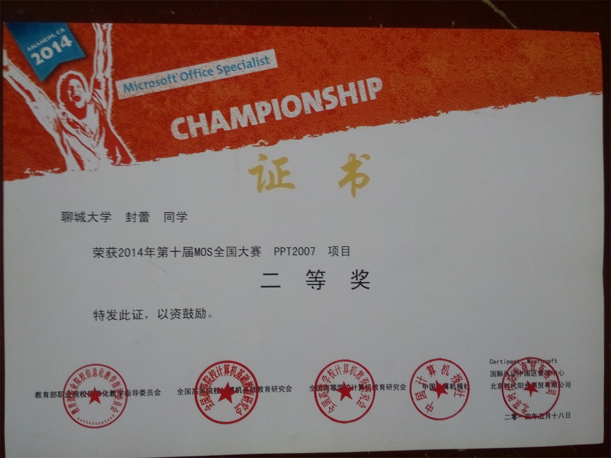 封蕾荣获2014年第十届MOS全国大赛 PPT2007 项目二等奖
