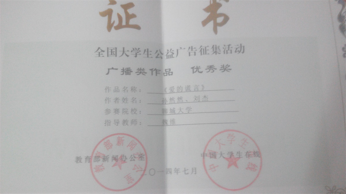 孙然然、刘杰《爱的谎言》全国老员工公益广告征集活动广播类作品优秀奖