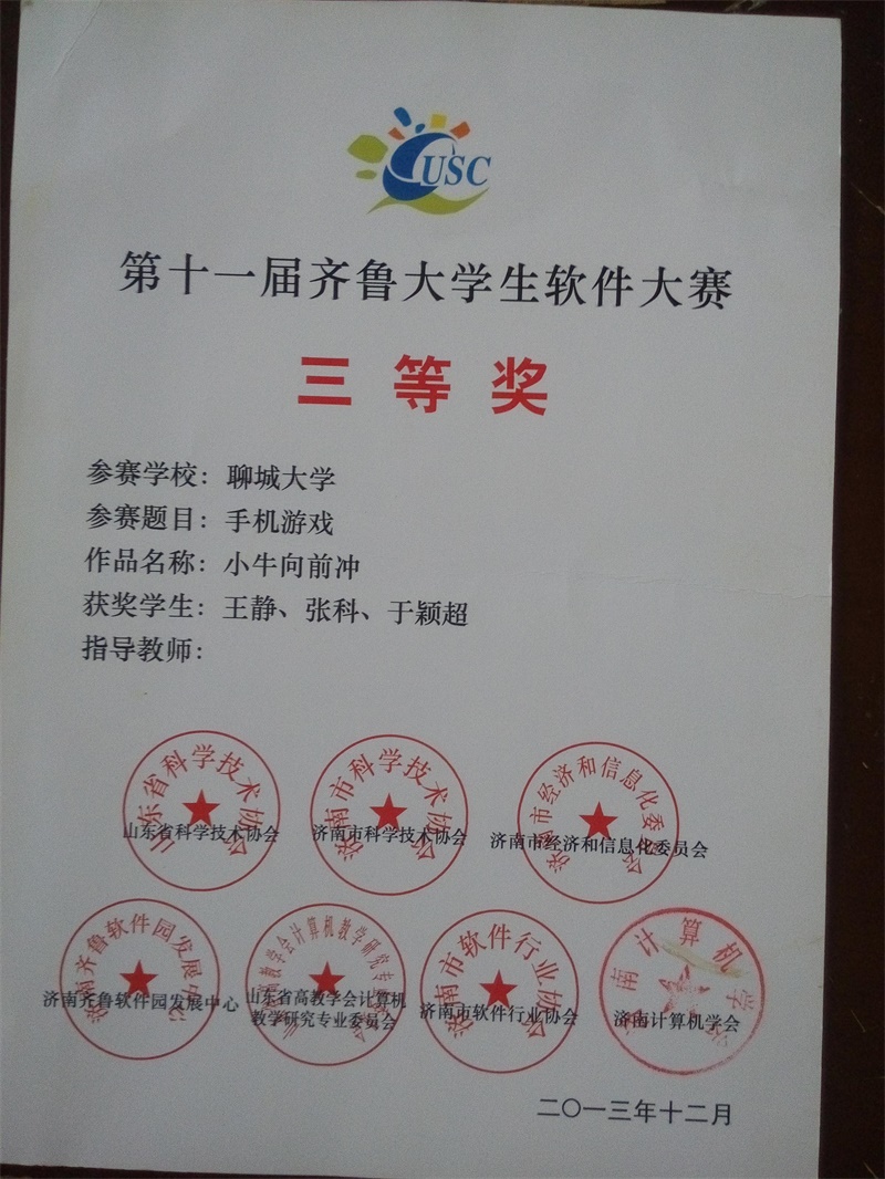 王静、 张科、 于颖超《小牛向前冲》获第十一届齐鲁老员工软件大赛三等奖