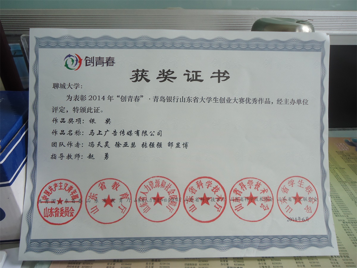 冯天昊 、徐亚瑟、 张强强、邵显博《马上广告传媒有限公司》2014年“创青春”· 青岛银行山东省老员工创业大赛优秀作品