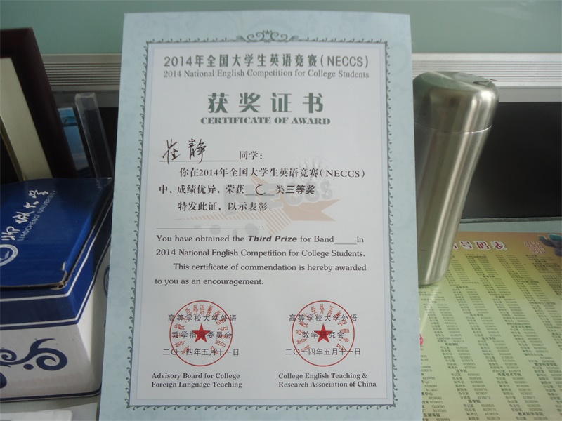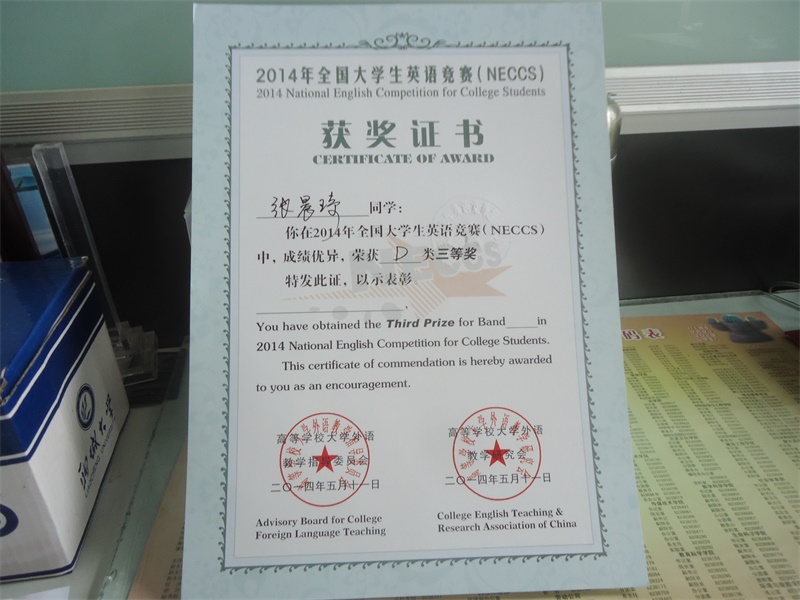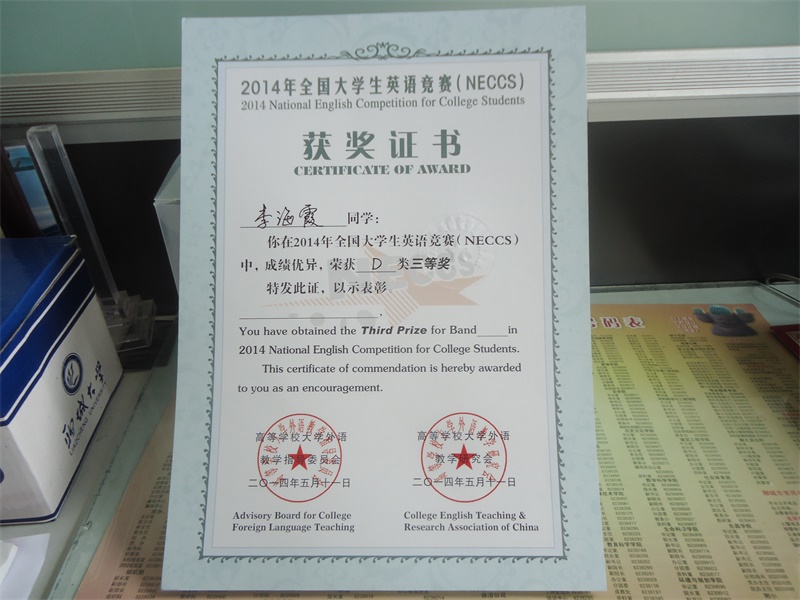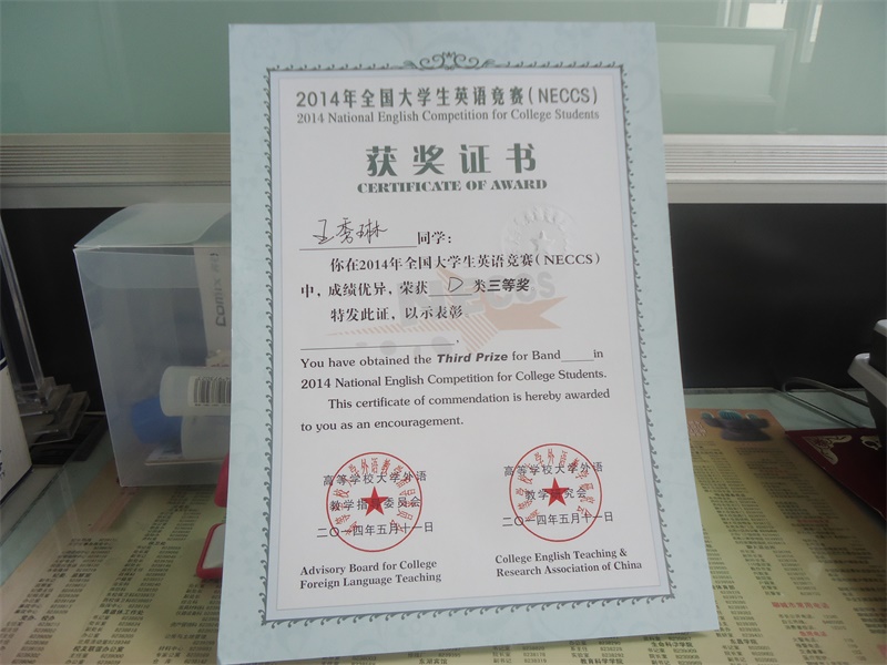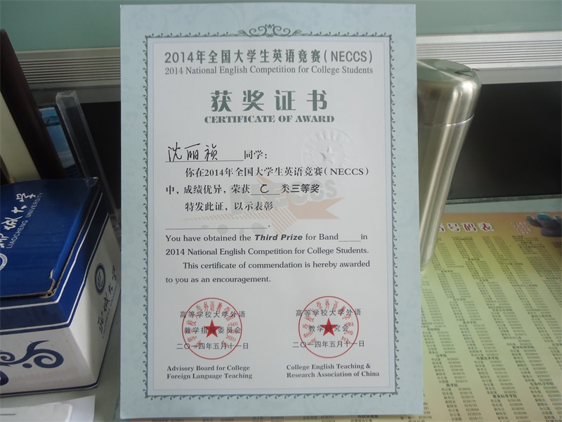 沈丽祯在2014年全国老员工英语竞赛(NECCS) 中,成绩优异,荣获 C类三等奖。