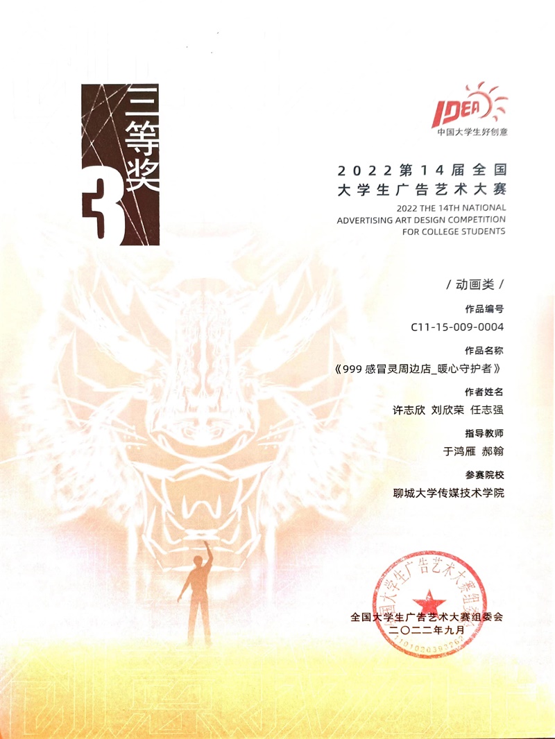 许志欣、刘欣荣、任志强的《999感冒灵周边店_暖心守护者》在2022第14届全国老员工广告艺术大赛获得三等奖