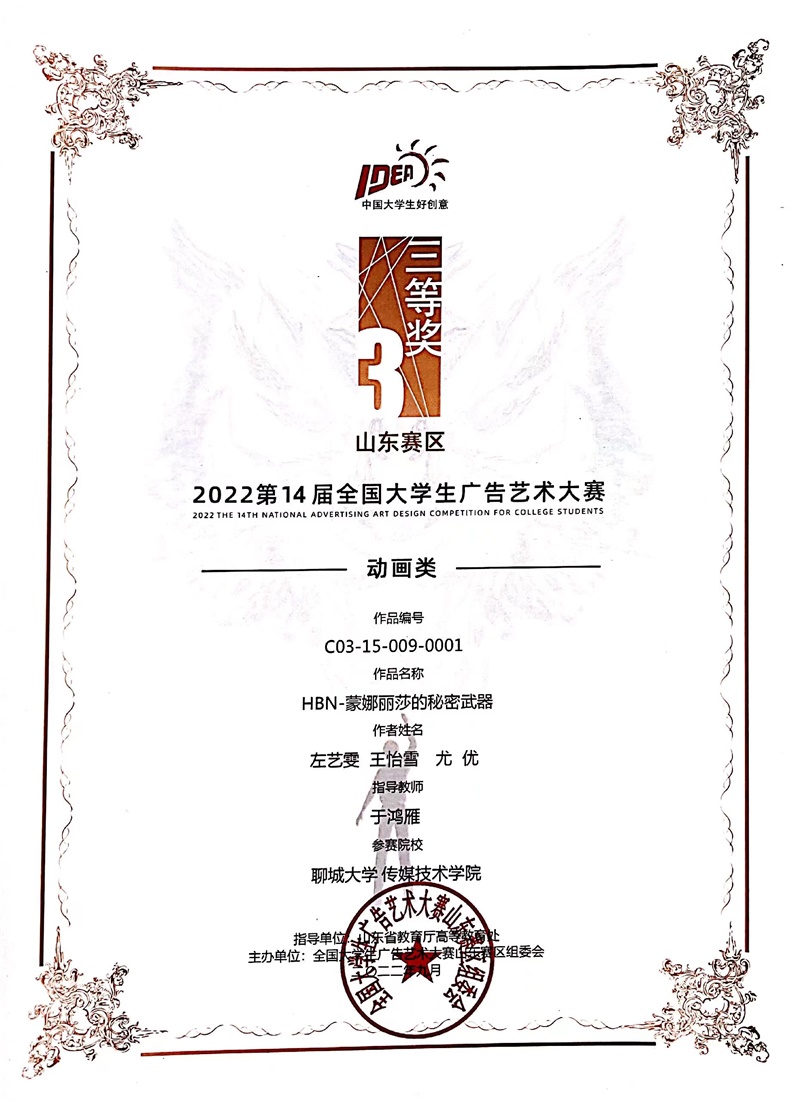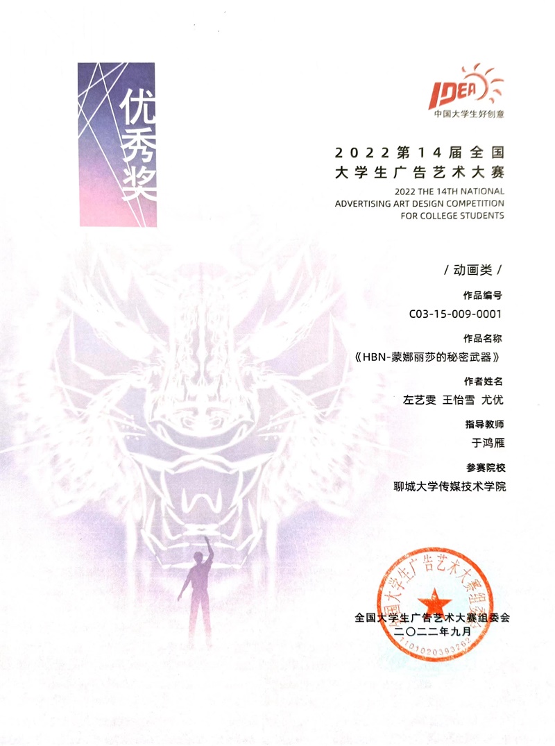 左艺雯、王怡雪、尤优的《HBN-蒙娜丽莎的秘密武器》获得优秀奖