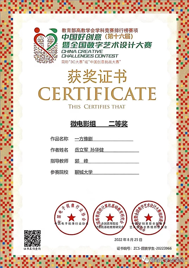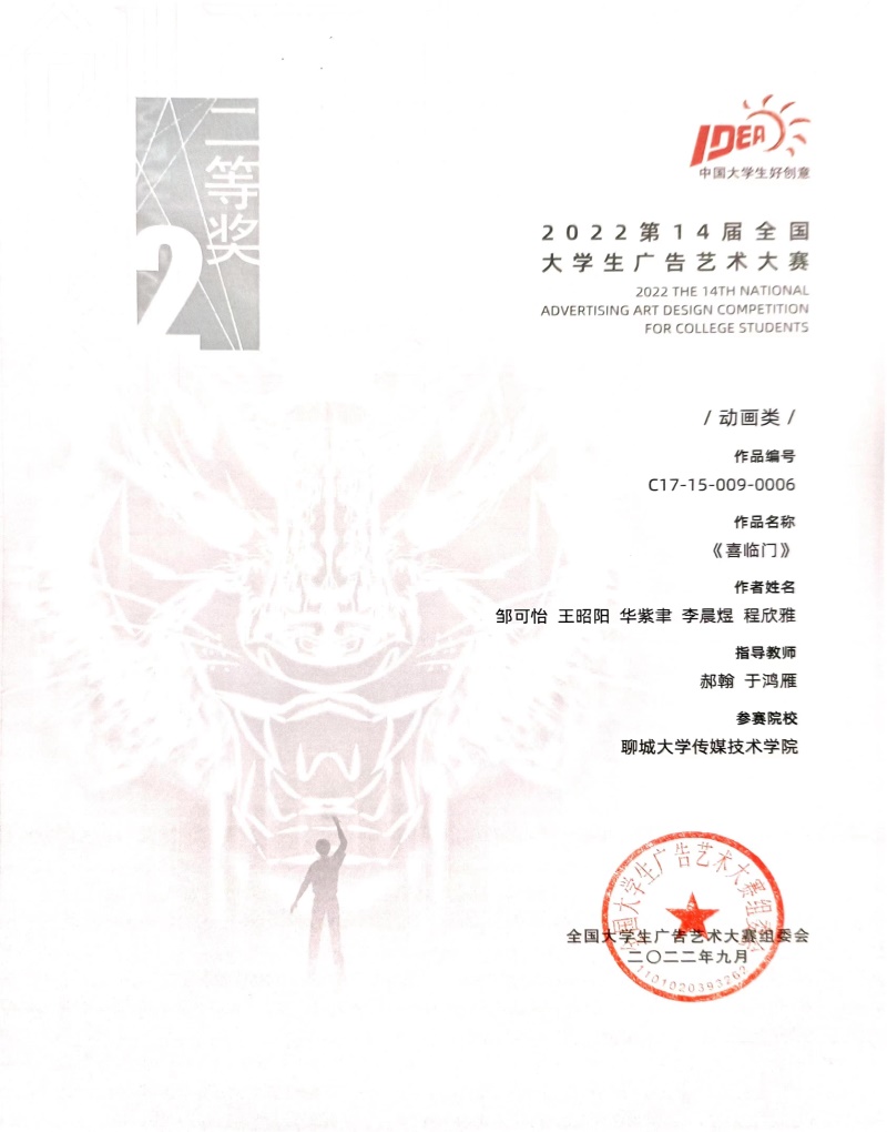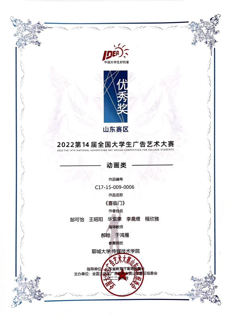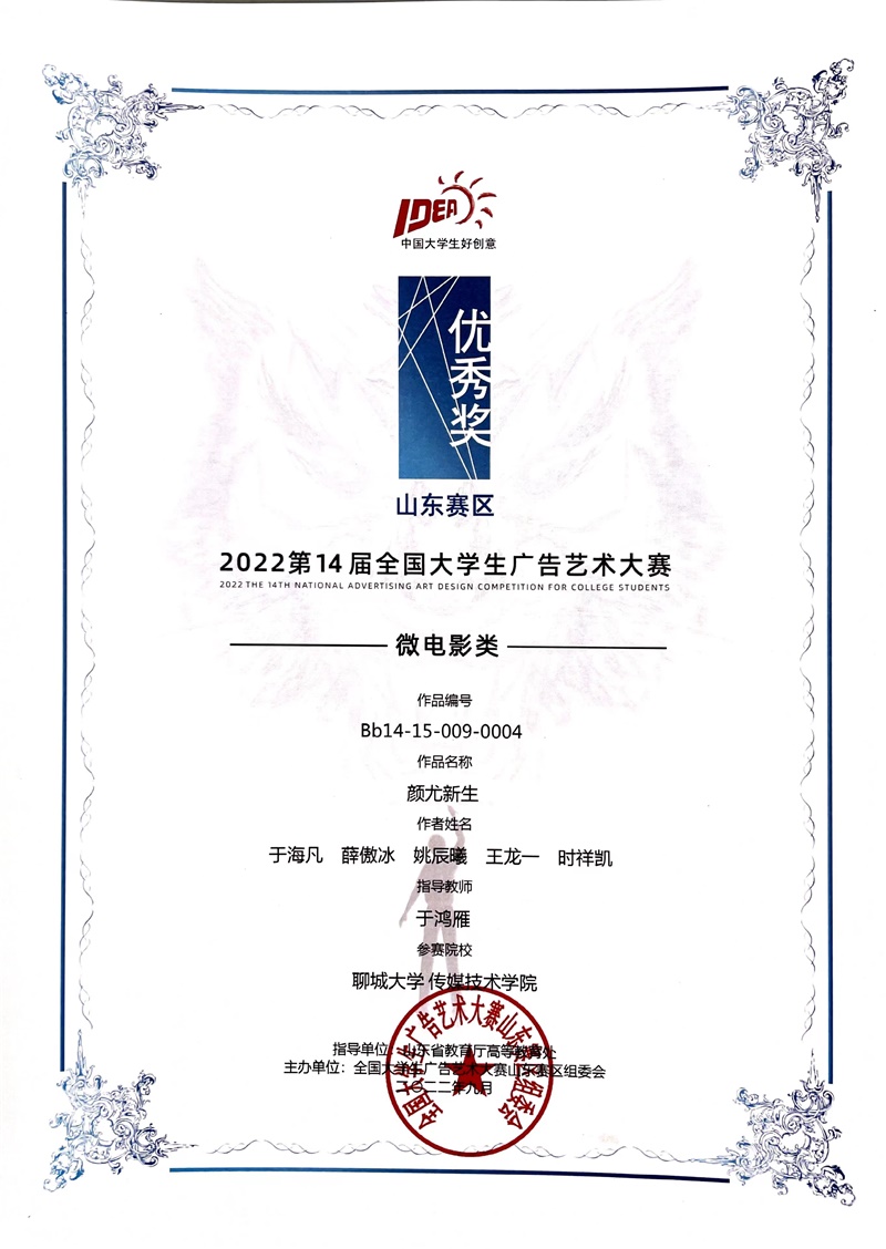 于海凡、薛傲冰、姚辰曦、王龙一、时祥凯的《颜尤新生》获得优秀奖