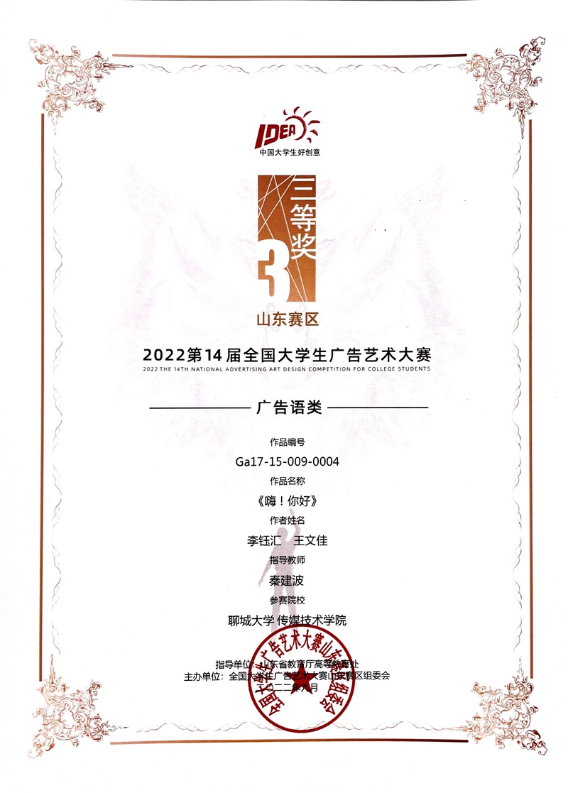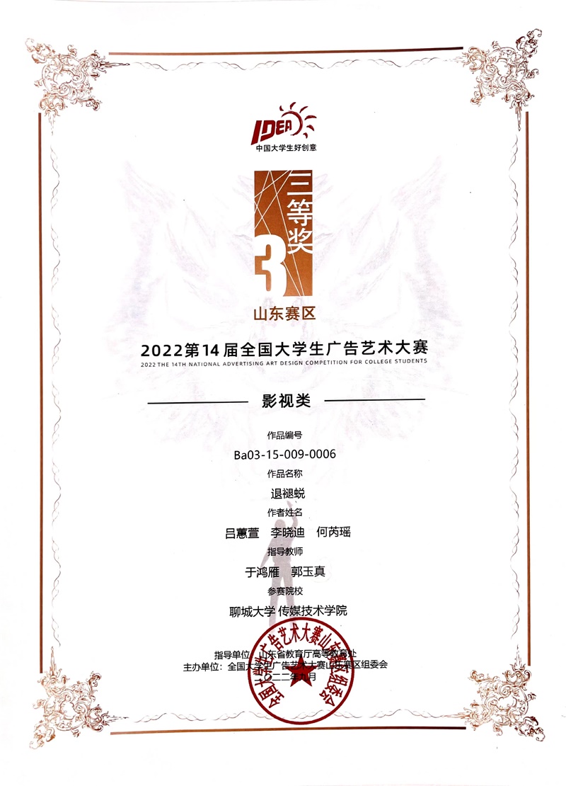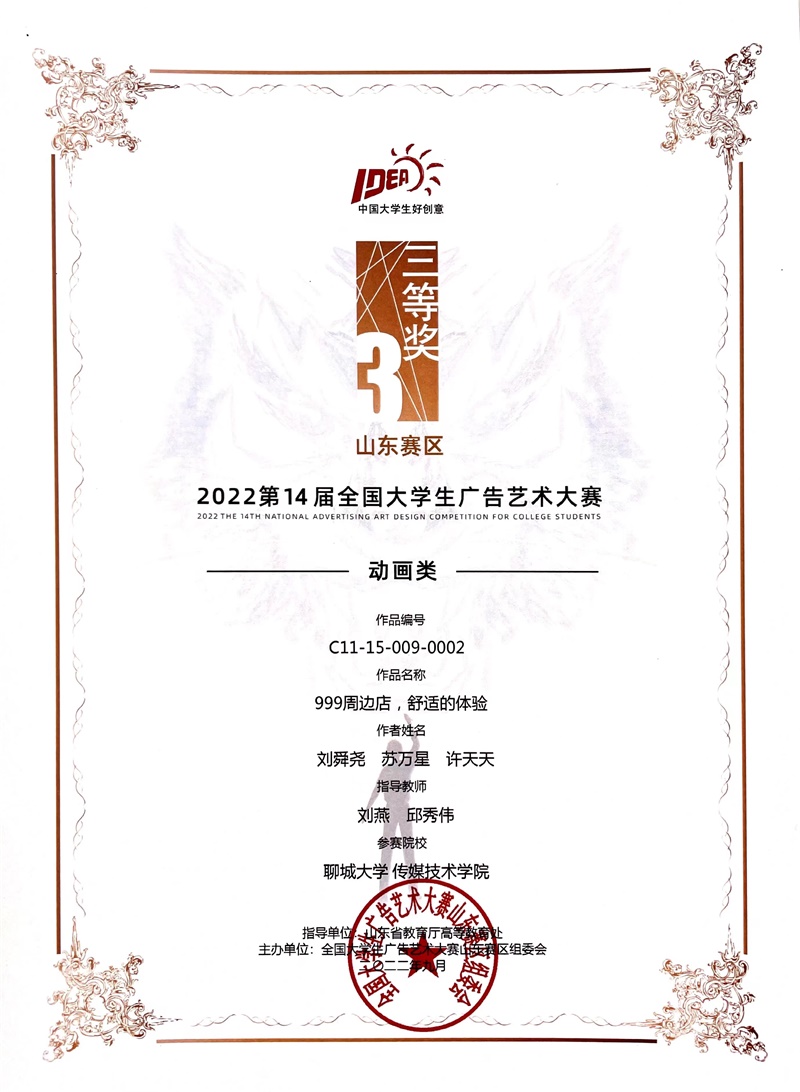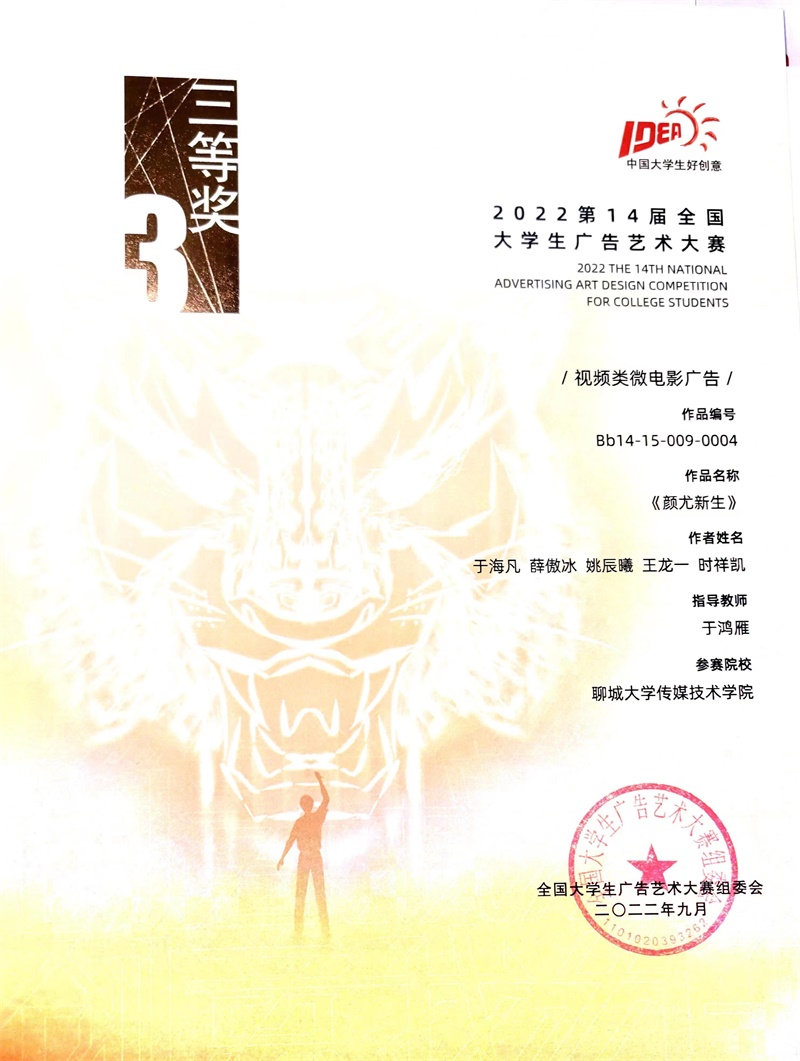 于海凡、薛傲冰、姚辰曦、王龙一、时祥凯的《颜尤新生》获得三等奖