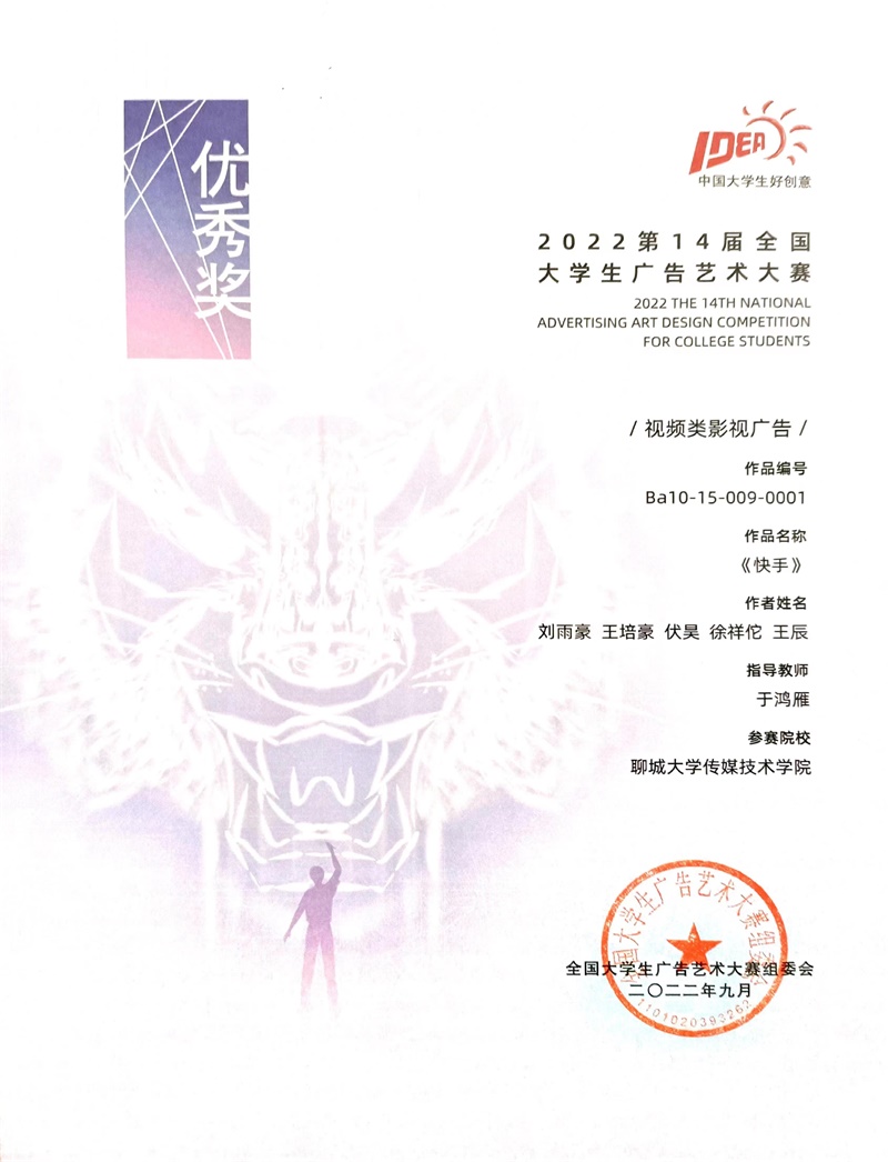 刘雨豪、王培豪、伏昊、徐祥佗、王辰的《快手》获得优秀奖
