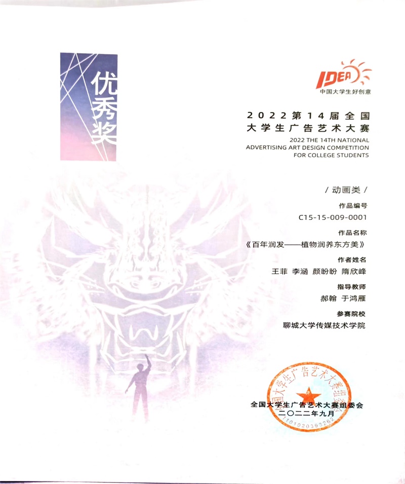 王菲、李涵、颜盼盼、隋欣峰的《百年润发——植物润养东方美》获得优秀奖