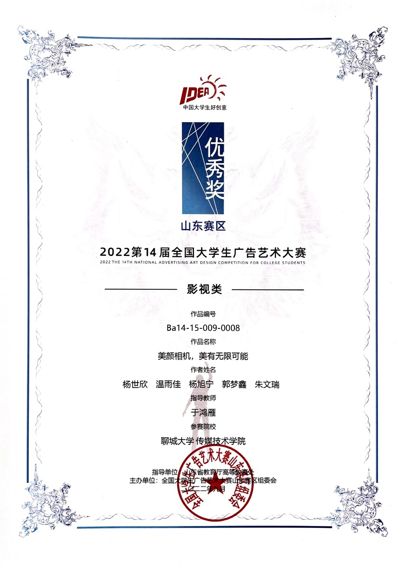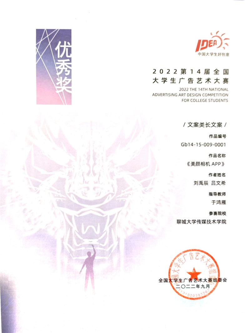 杨世欣、温雨佳、杨旭宁、郭梦鑫、朱文瑞的《美颜相机,美有无限可能》获得优秀奖