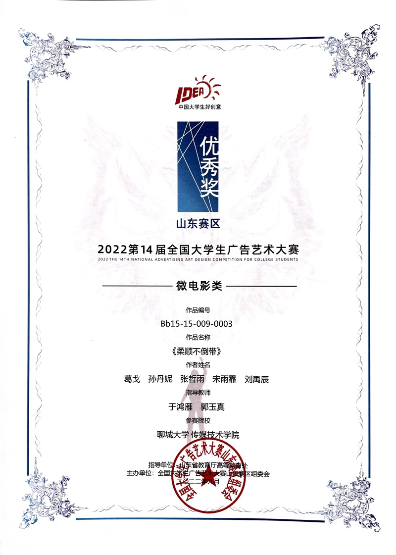葛戈、孙丹妮、张哲雨、宋雨霏、刘禹辰的《柔顺不倒带》获得优秀奖