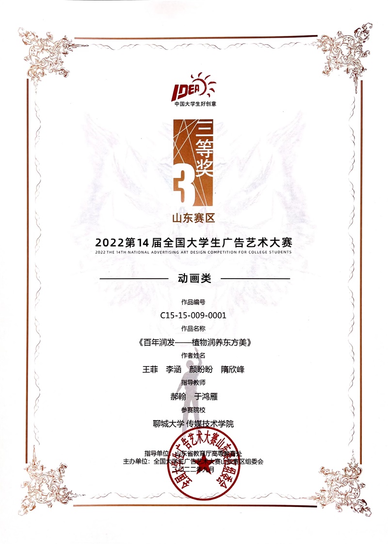 王菲、李涵、颜盼盼、隋欣峰的《百年润发——植物润养东方红》获得三等奖