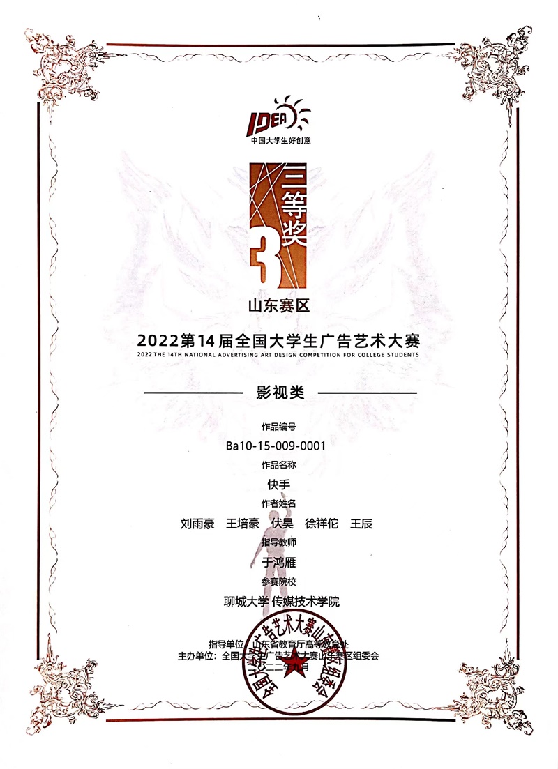 刘雨豪、王培豪、伏昊、徐祥佗、王辰的《快手》获得三等奖