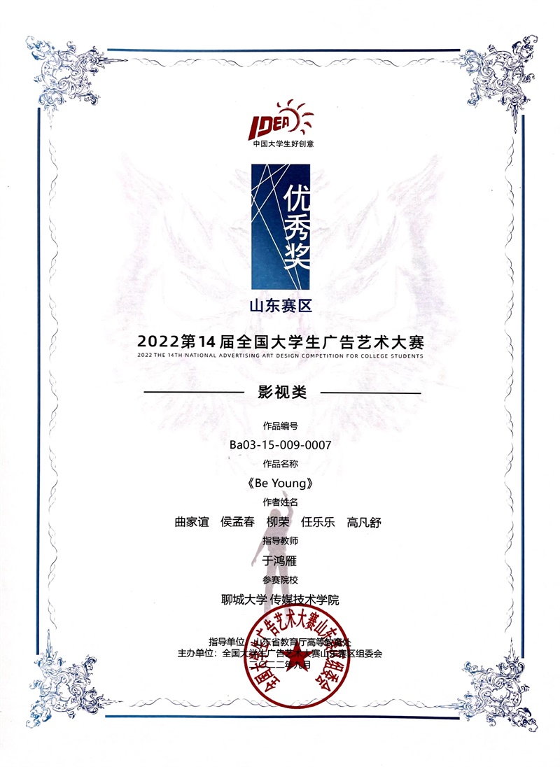 曲家谊、侯孟春、柳荣、任乐乐、高凡舒的《Be Young》获得优秀奖