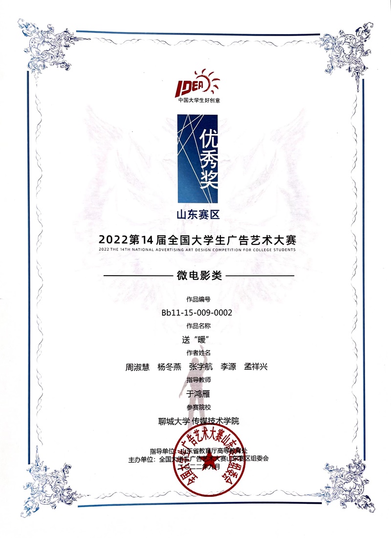 周淑慧、杨冬燕、张字航、李源、孟祥兴的《送“暖”》获得优秀奖