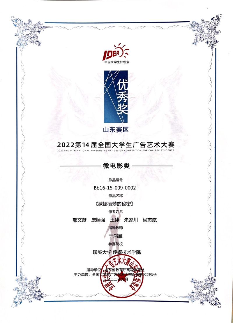 邢文彦、庞顺强、王律、朱家川、侯志航的《蒙娜丽莎的秘密》获得优秀奖