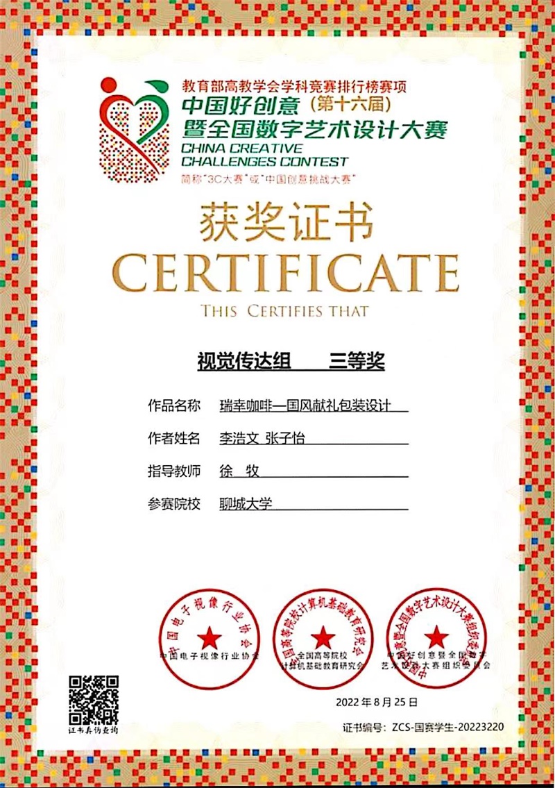 李浩文、张子怡的《瑞幸咖啡——国风献礼包装设计》获得三等奖