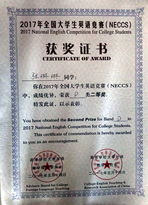 张琳琳,全国老员工英语竞赛二等奖