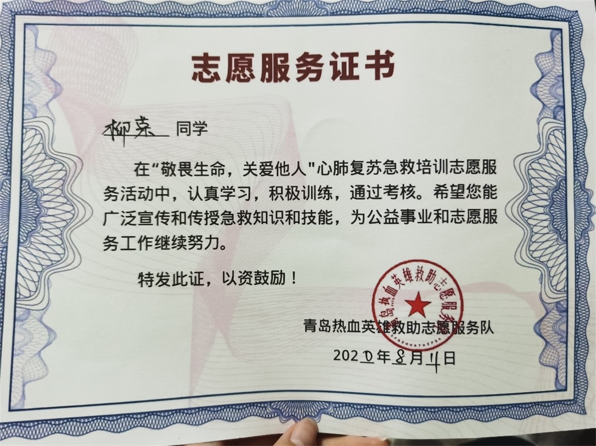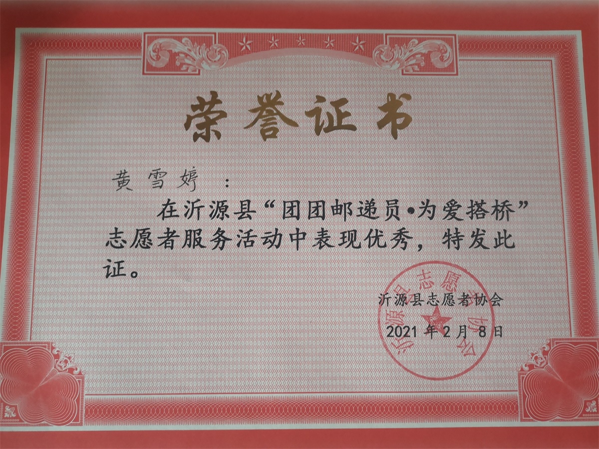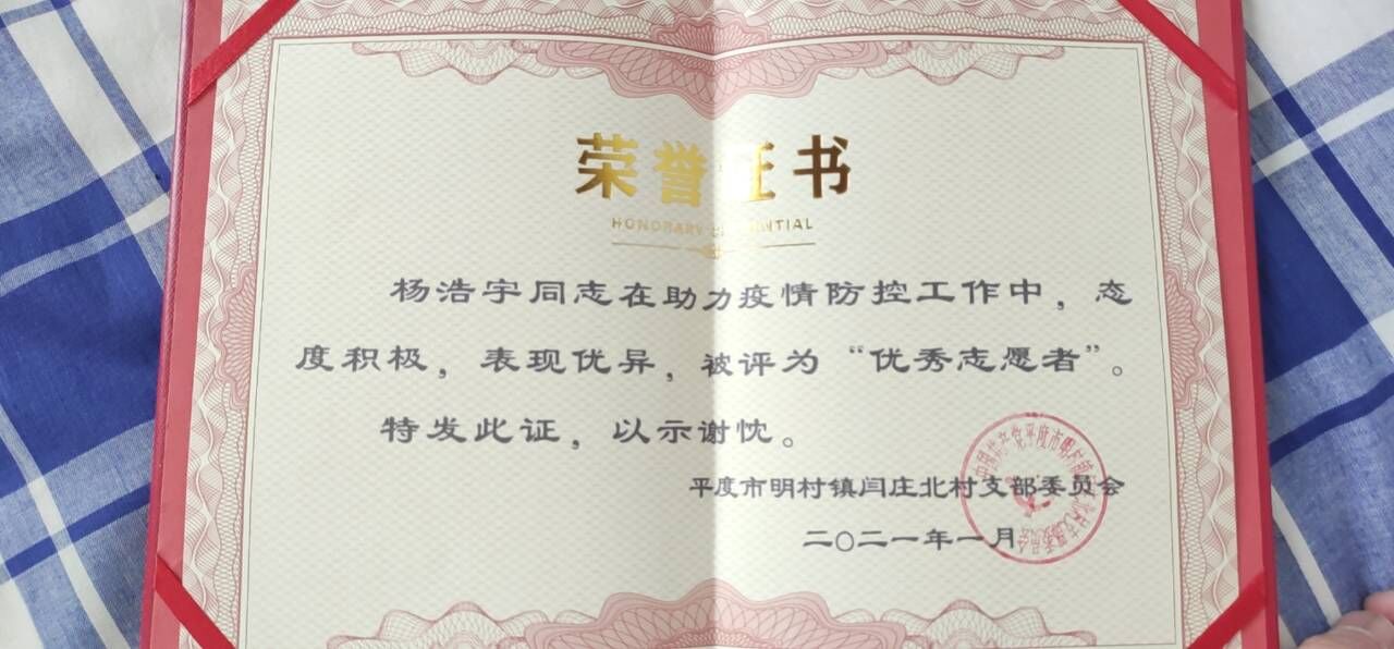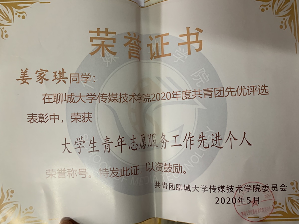 姜家琪获得2020年老员工青年志愿服务工作先进个人