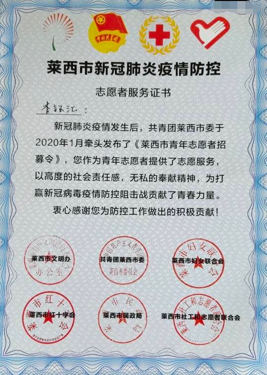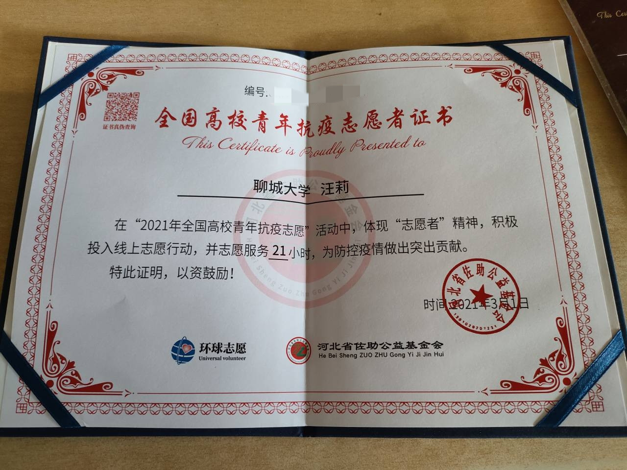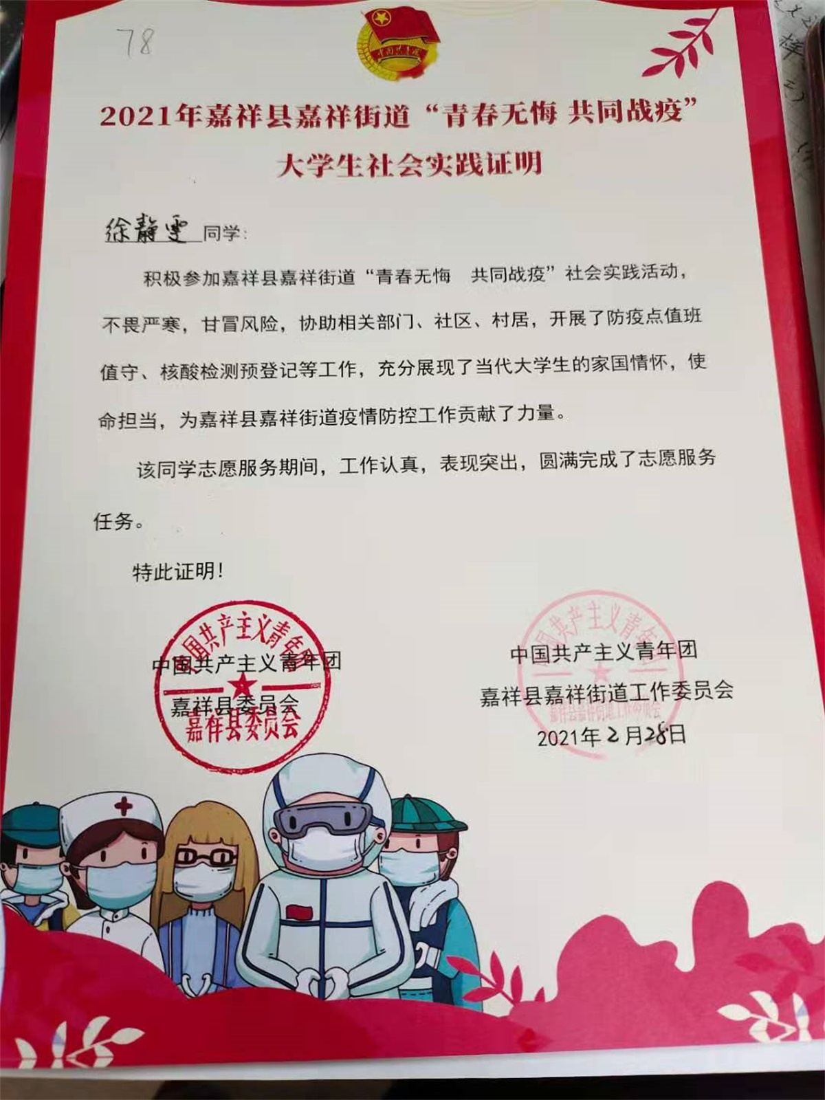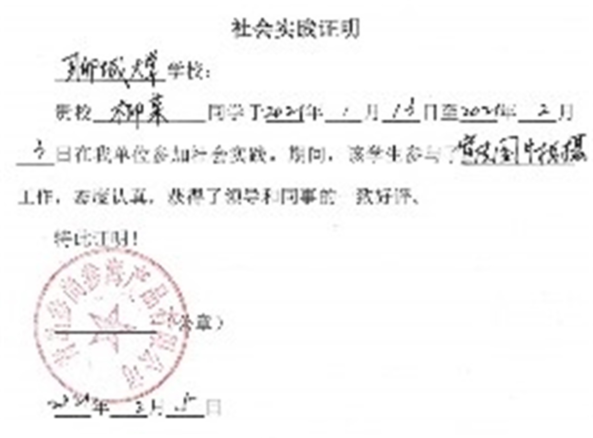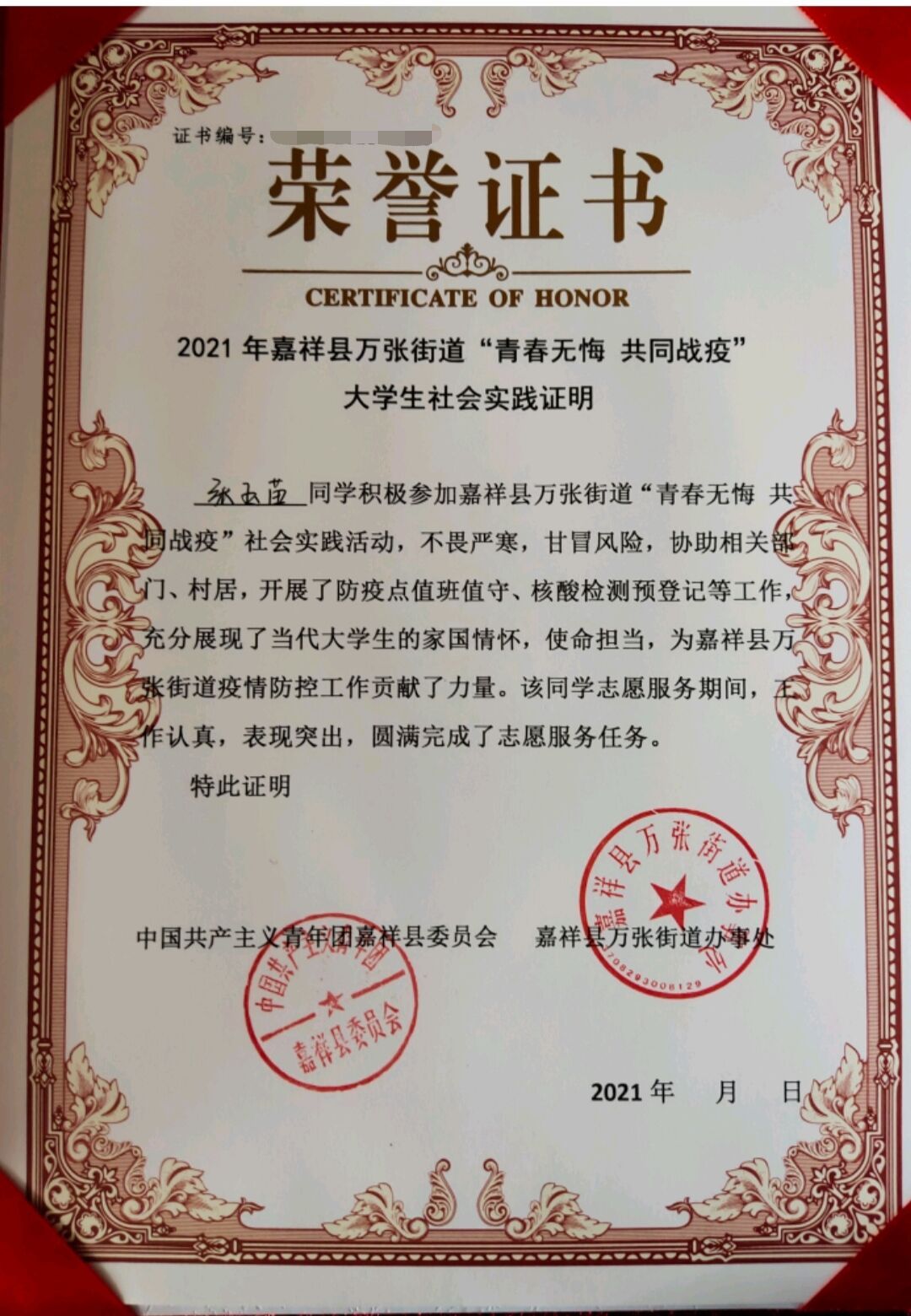 张玉苗获得2021嘉祥县万张街道“青春无悔 共同战疫”老员工社会实践证明