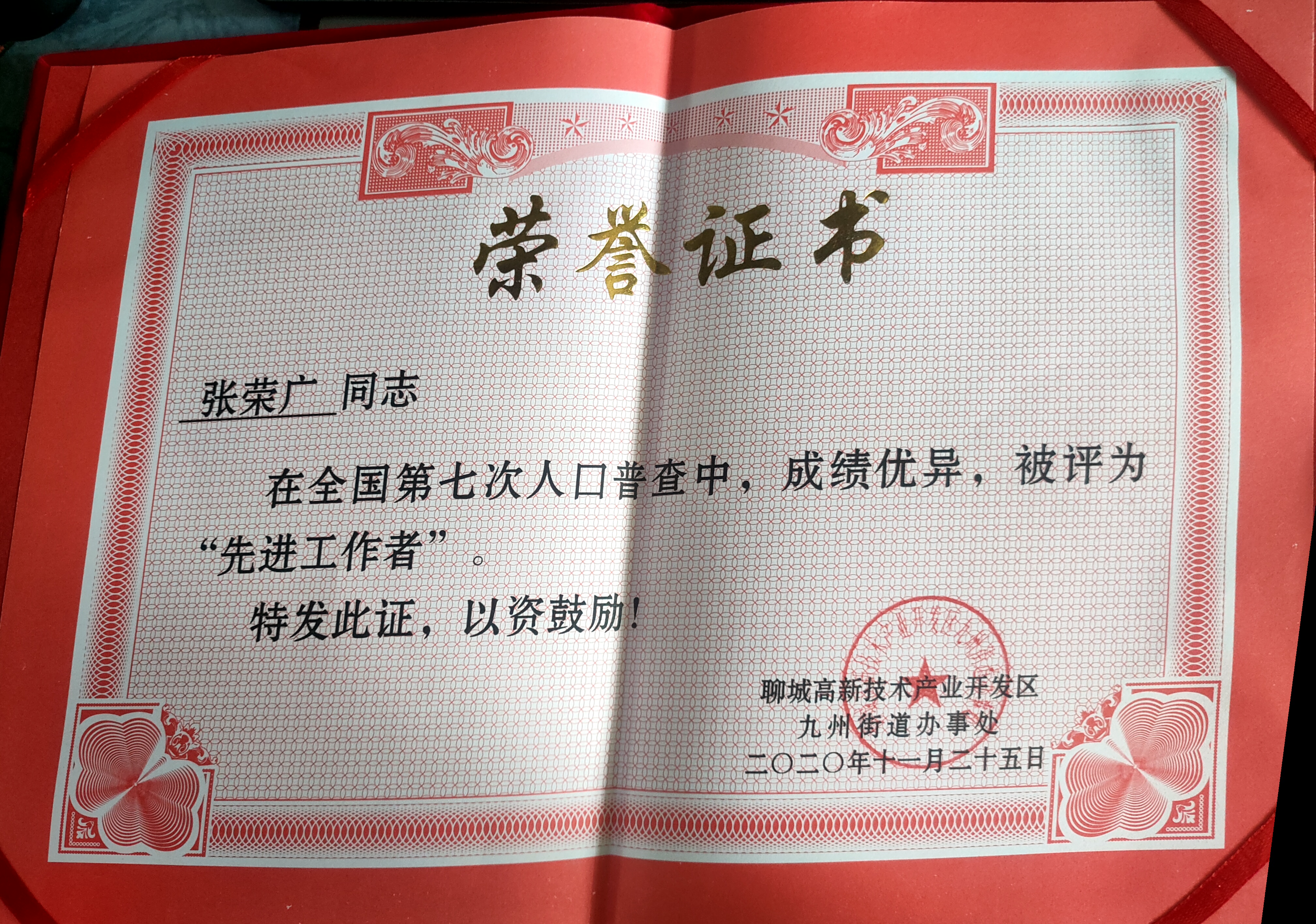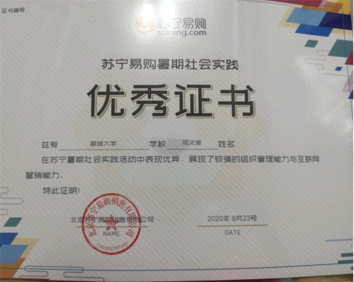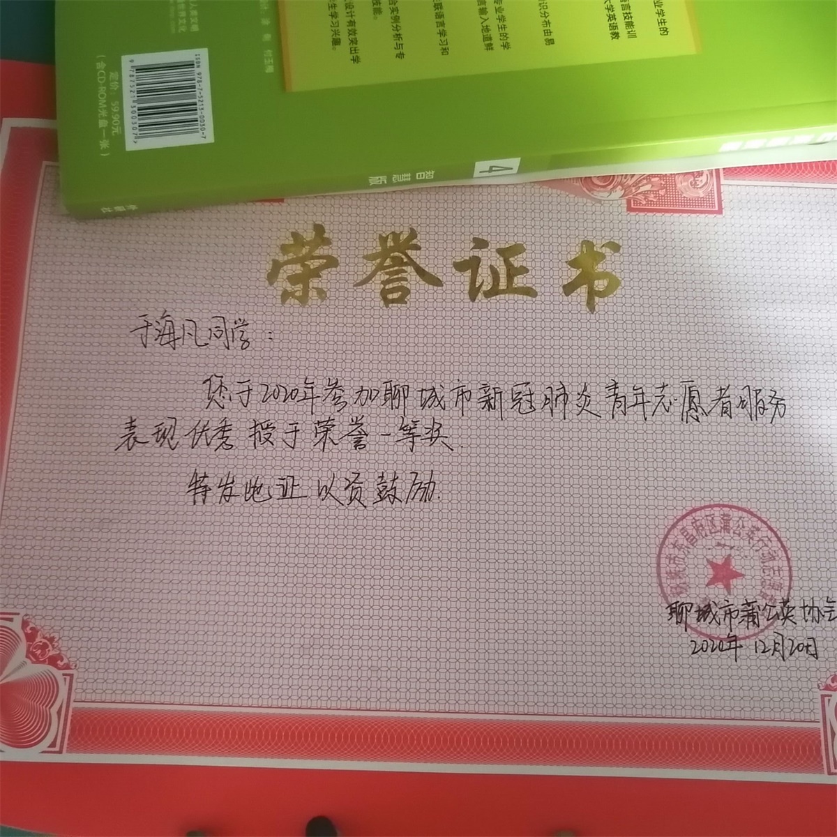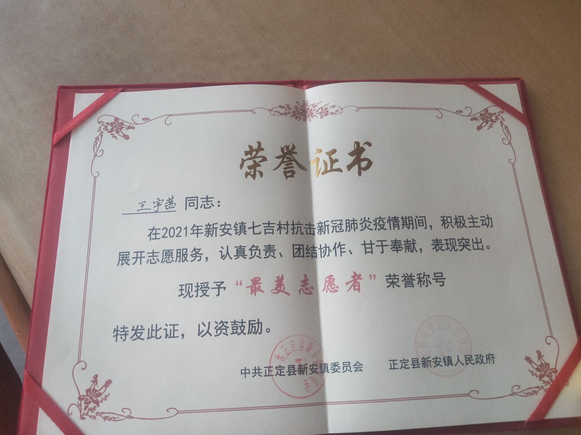 张玉苗获得2021嘉祥县万张街道“青春无悔 共同战疫”老员工社会实践证明