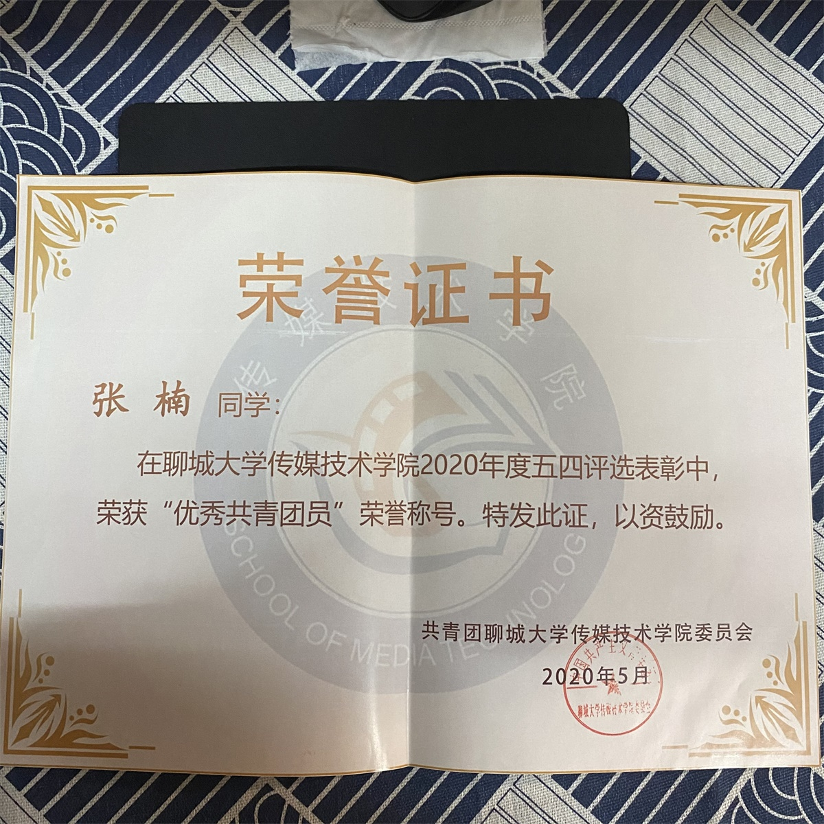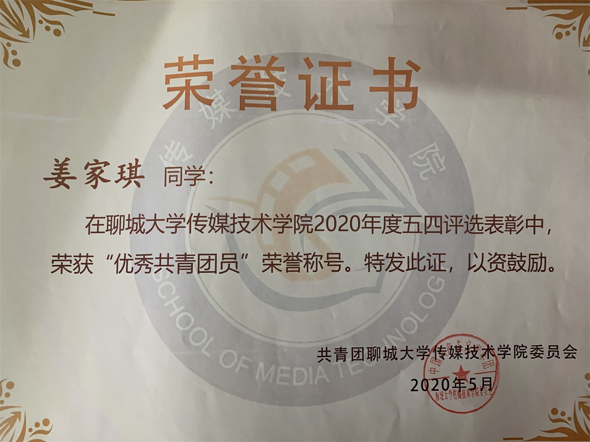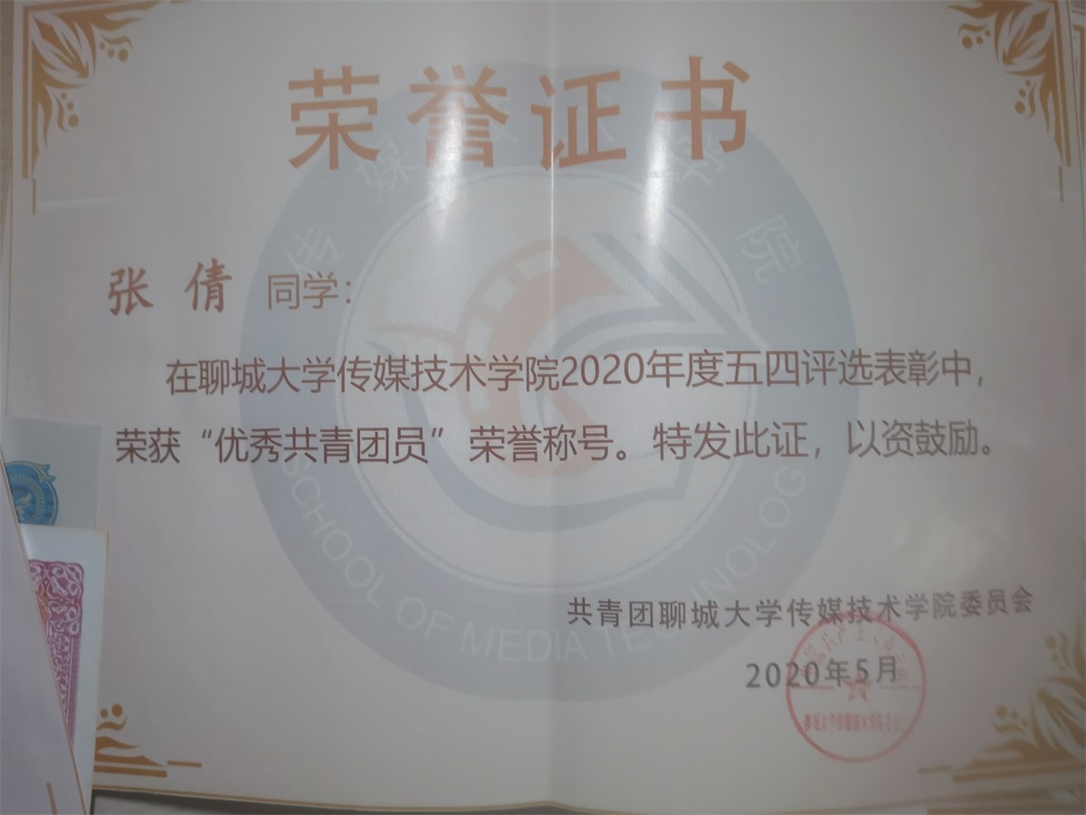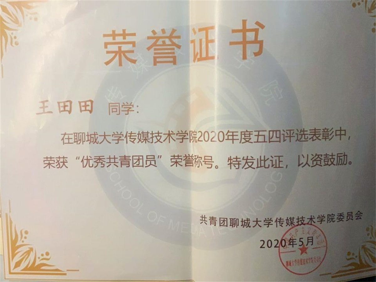 杜龙雪获得2020年度共青团思想引领和宣传教育工作先进个人称号