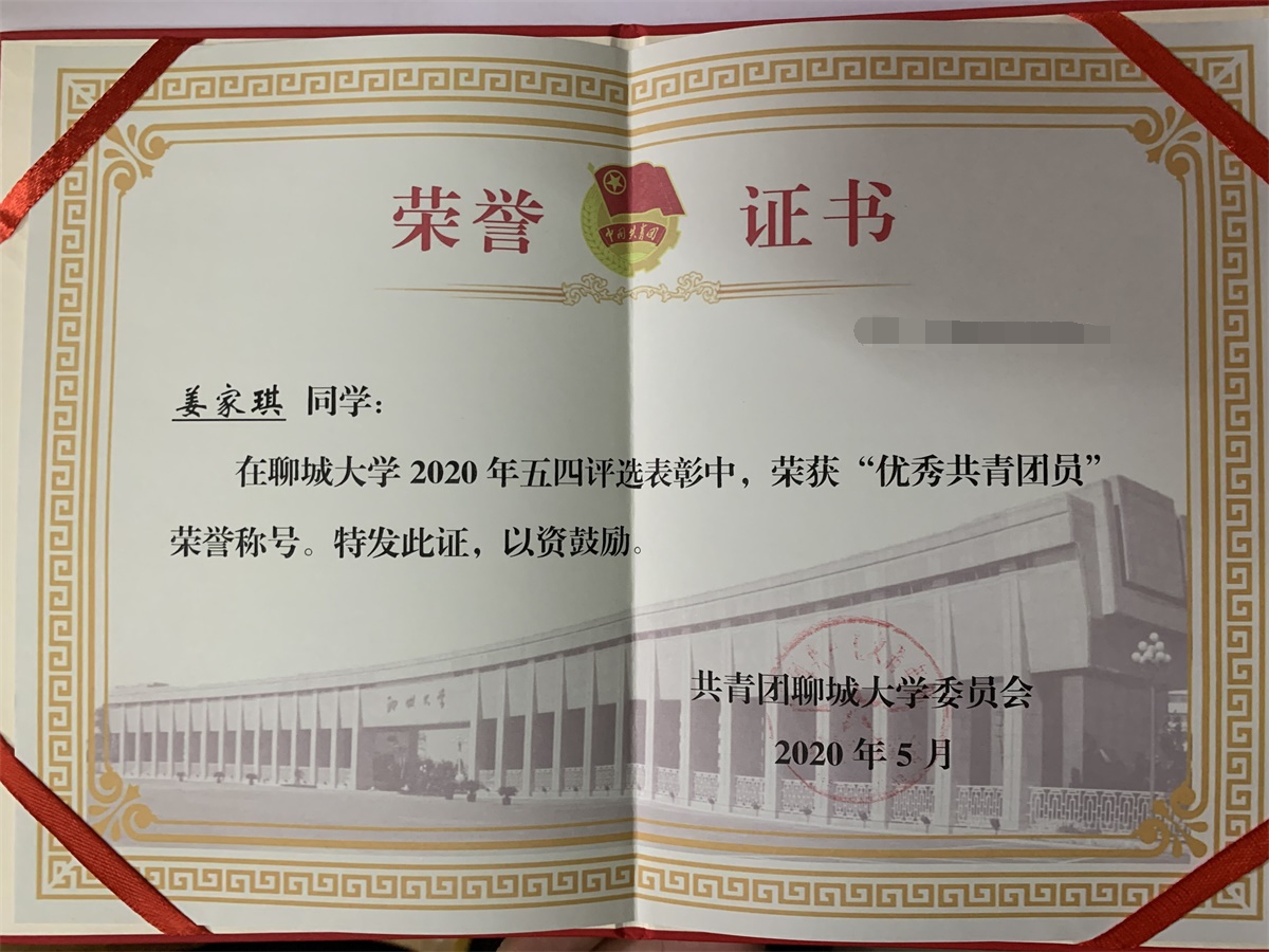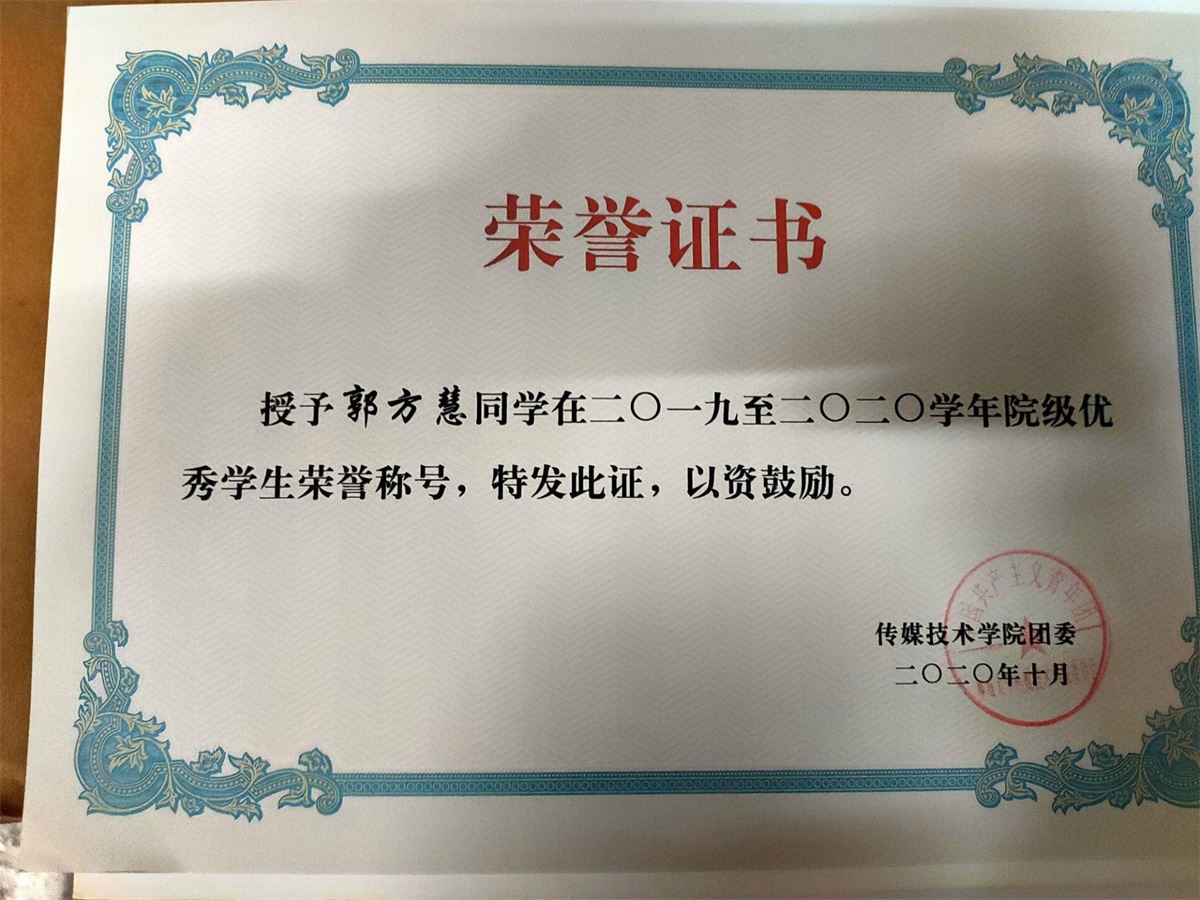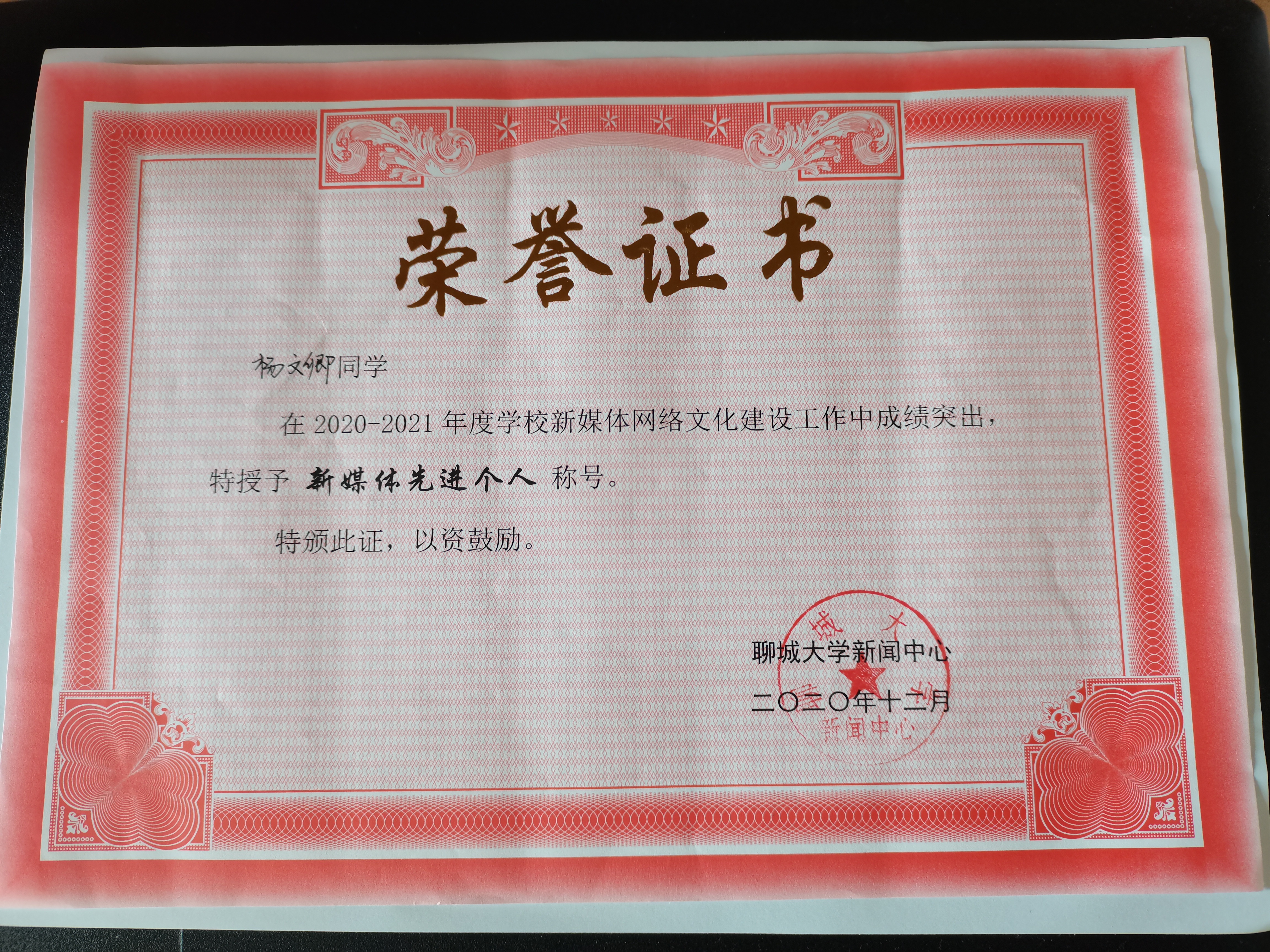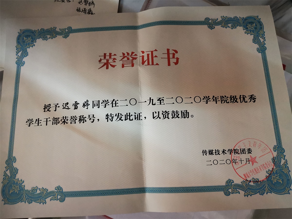 杜龙雪获得2020年度共青团思想引领和宣传教育工作先进个人称号