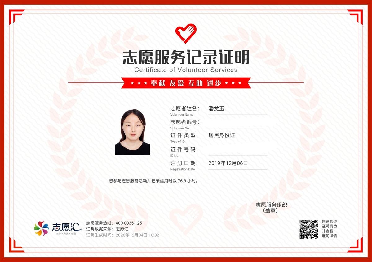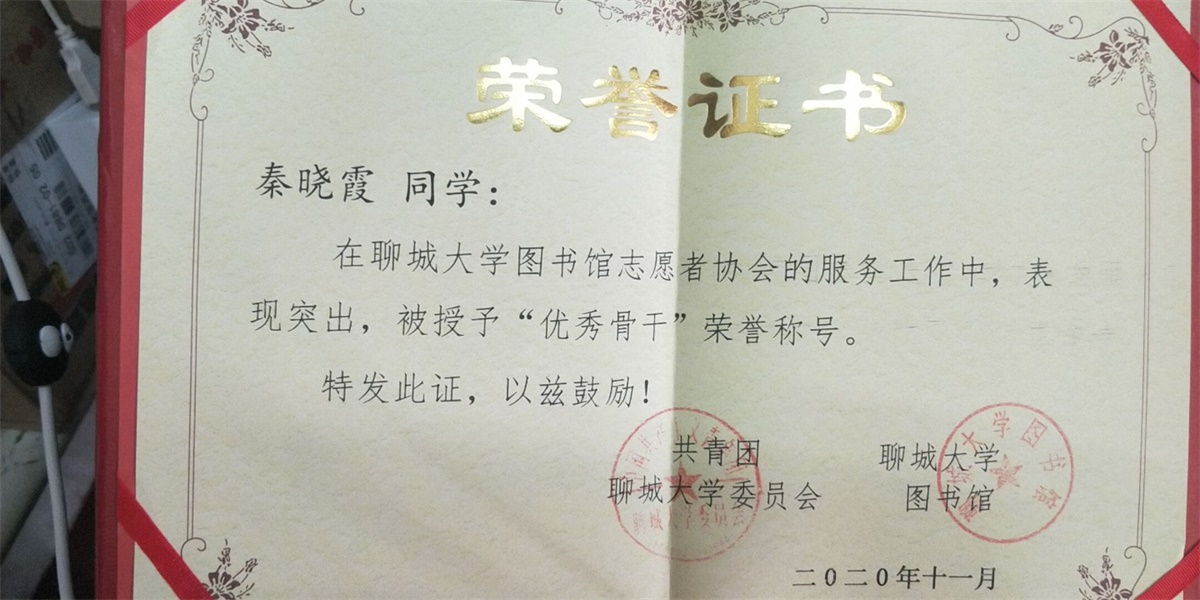 秦晓霞在w66图书馆志愿者协会的服务工作汇总获得“优秀骨干”称号