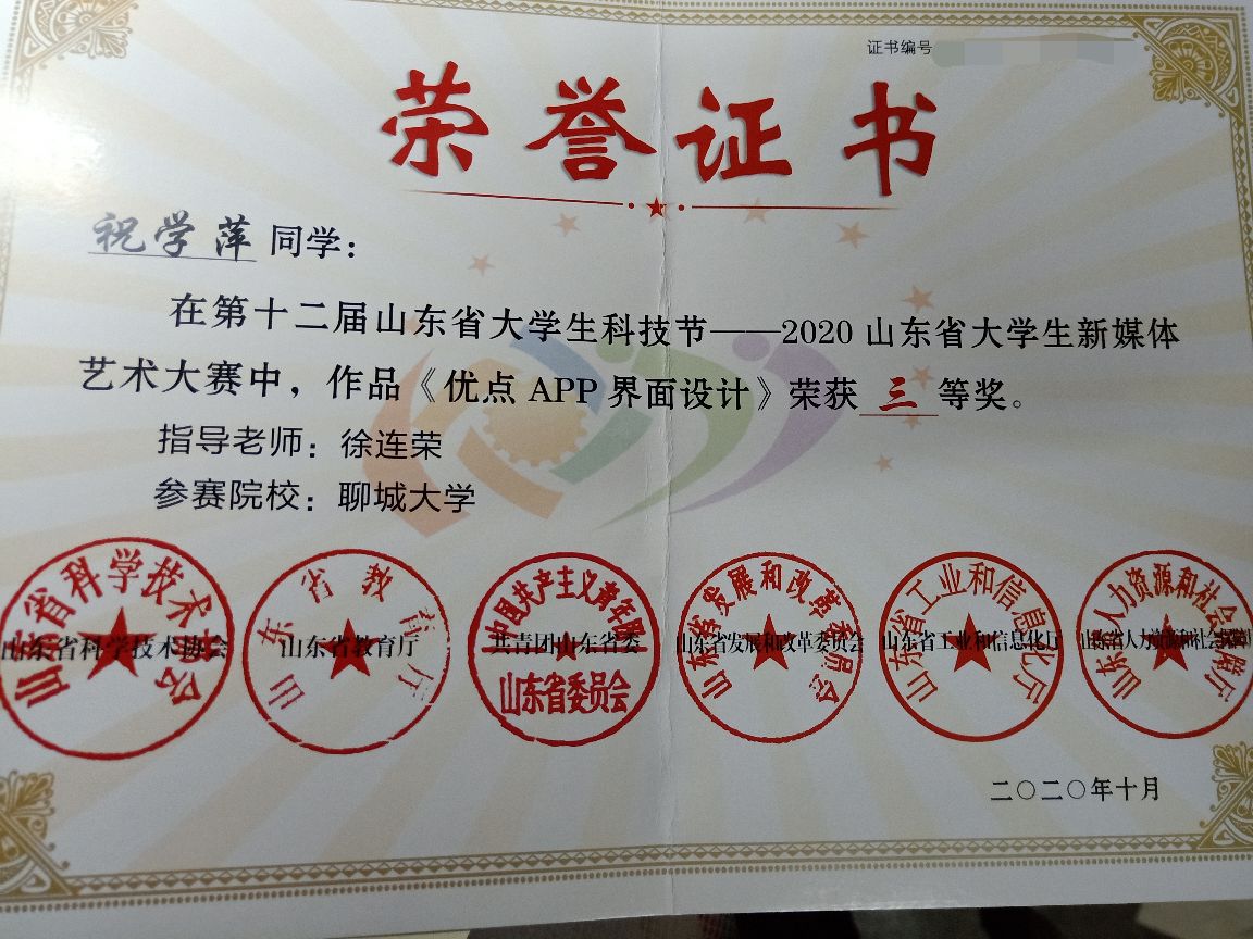 祝学萍扥《优点APP界面设计》获得2020山东省老员工新媒体艺术大赛三等奖