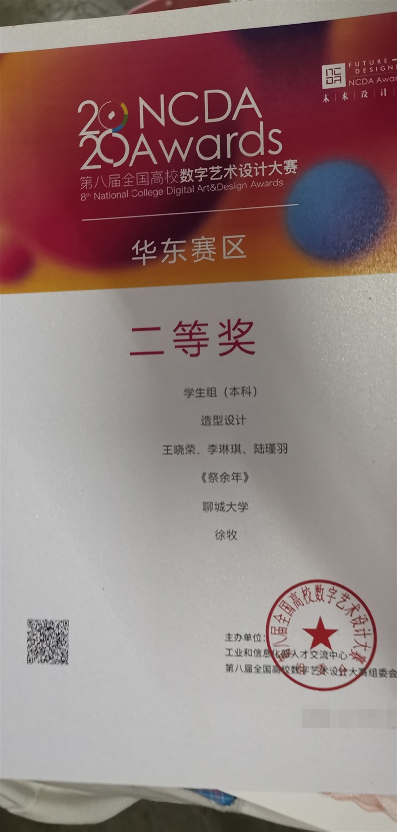 王晓荣 李琳琪 陆瑾羽的《祭余年》获得迪拜姐全国高校数字艺术设计大赛华东赛区二等奖