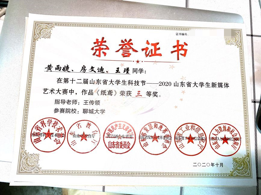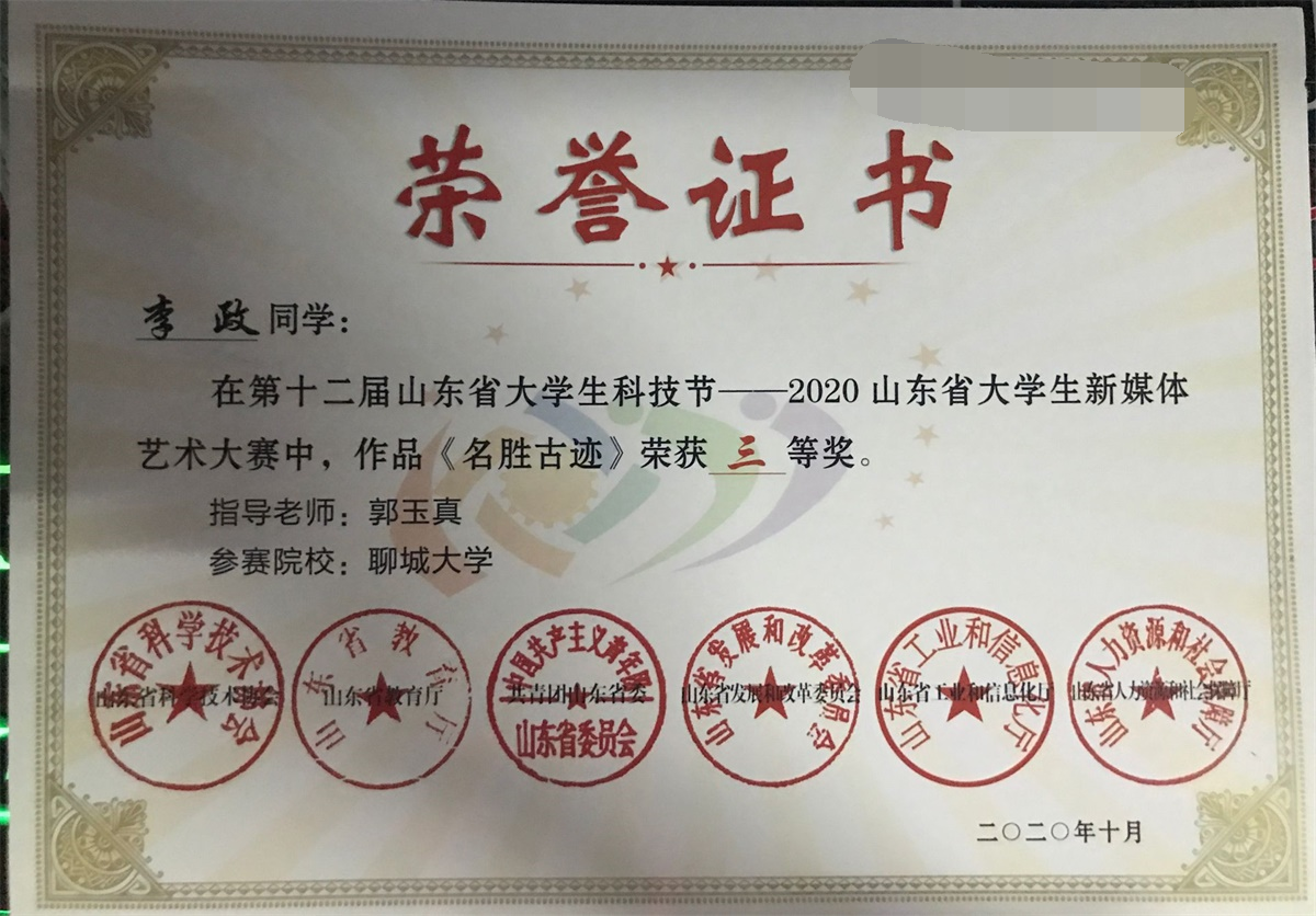 李政的《名胜古迹》在2020山东省老员工新媒体艺术大赛中获得三等奖