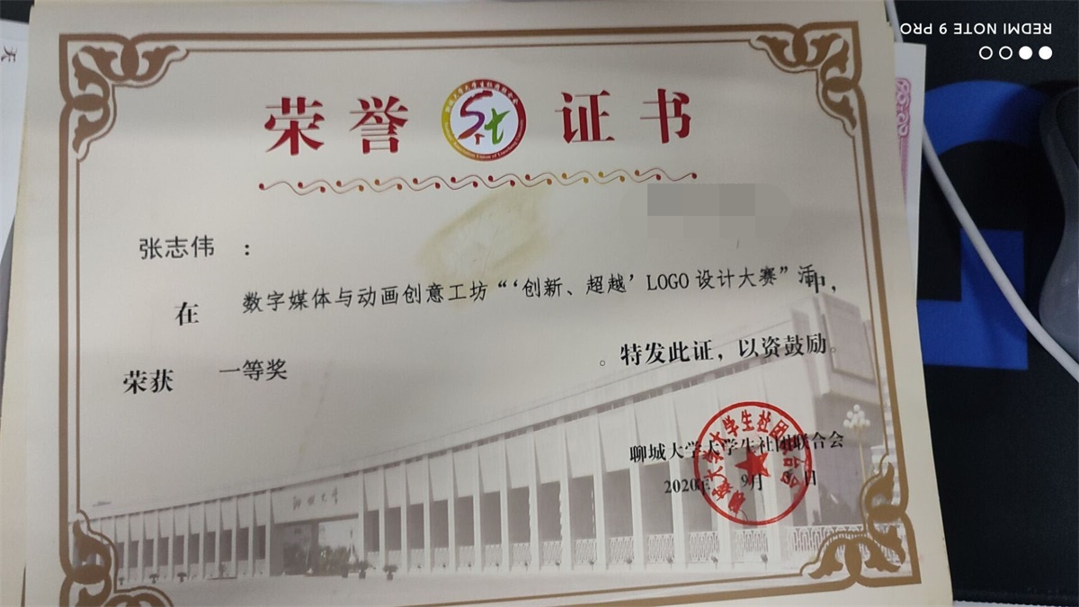 张志伟在数字媒体与动画创意工坊“创新 超越LOGO设计大赛”获得一等奖