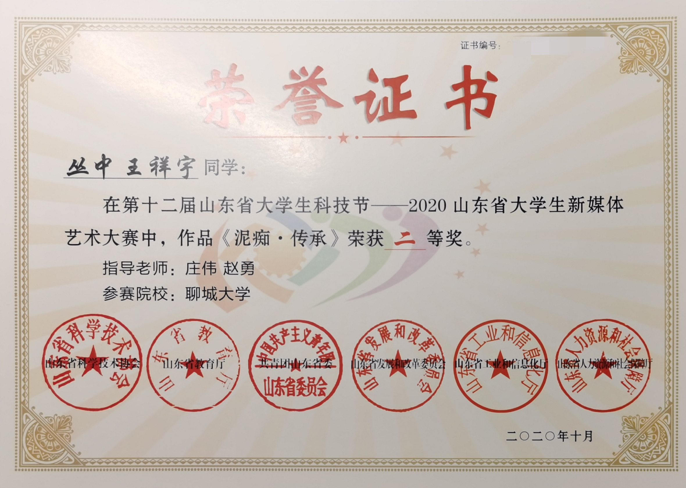 王田田在数字媒体与动画创意工坊”红色文化 传承有我“设计大赛获得二等奖