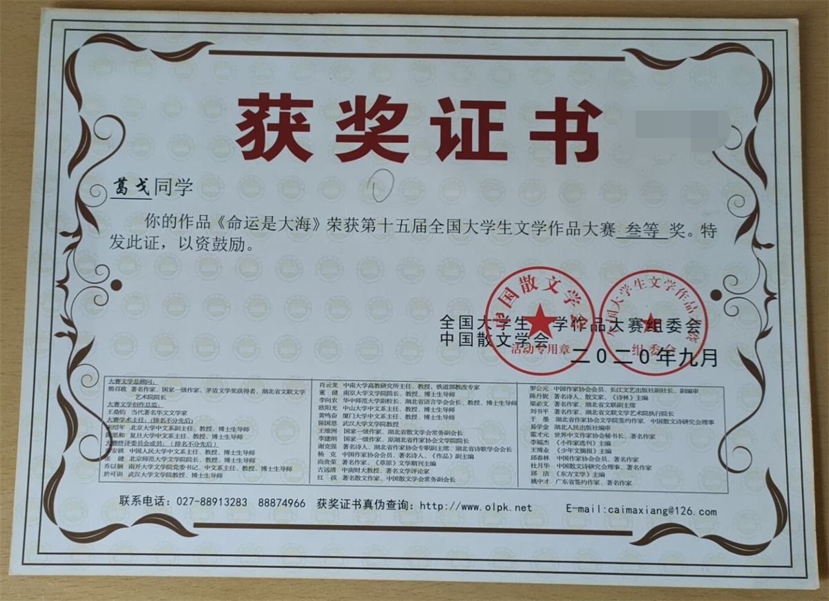 葛戈,2020年第十五届全国老员工文学作品大赛三等奖