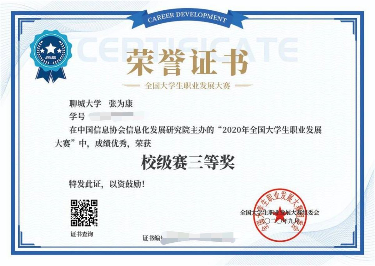张为康,2020年全国老员工职业发展大赛校级赛三等奖