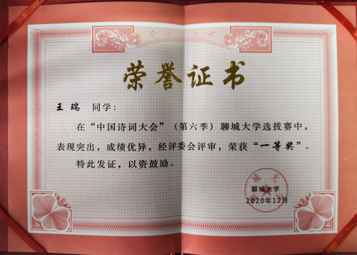 王瑞,“中国诗词大会”第六季w66选拔赛“一等奖”
