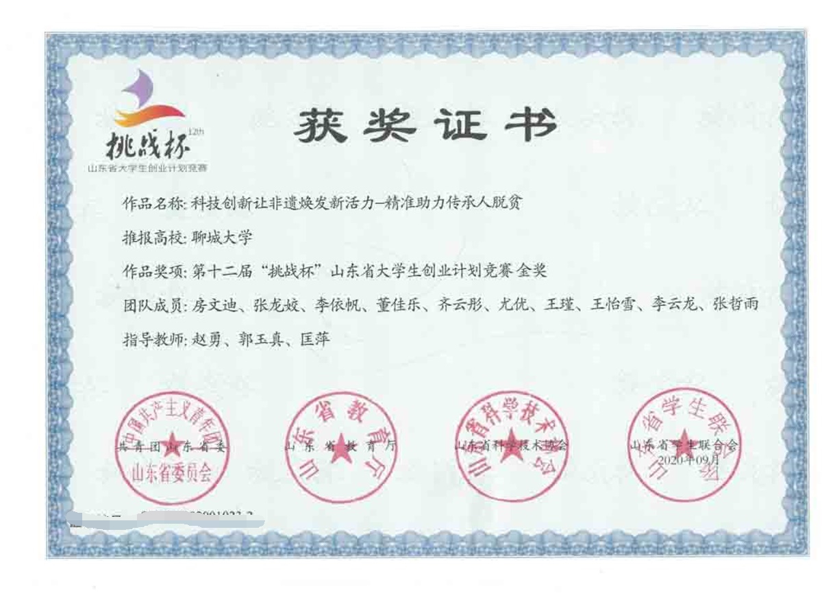 房文迪、张龙姣、李依帆、董佳乐、齐云彤、尤优、王瑾、 王怡雪、李云龙、张哲雨获第十二届“挑战杯”山东省老员工创业计划竞赛金奖