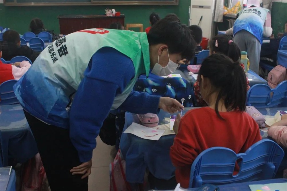 爱心相伴,志愿同行。志愿者借助自己制作的精美的PPT来向同学们展示手指画的内容,志愿者幽默有趣的语言活跃了课堂的氛围。带动了同学们的积极性,同学们紧跟志愿者的讲解思路,认真听讲,不断发问。