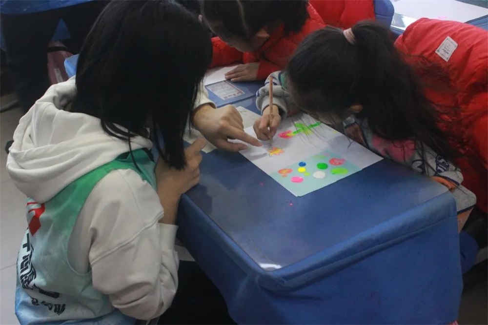 在基本了解手指画之后,志愿者为同学们分发不同颜色的颜料。同学们抬起一张张稚嫩的小脸,眼睛里透露出的满是期待,分发完成,大家都迫不及待用手蘸颜料在纸上画了起来,让自己的想法、灵感尽情地挥洒在纸上,纸上逐渐呈现出了毛毛虫、蝴蝶等各种美丽的图案。