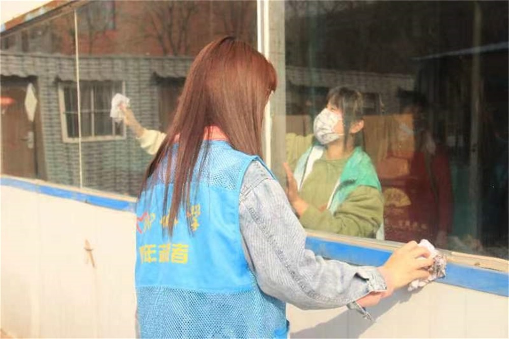 在敬老院工作人员的带领和指导下,志愿者们进行了明确合理的分工。部分成员拿起拖把和抹布,主动打扫卫生。他们配合默契,相互协作。一块玻璃由两位同学进行内外分工擦拭,一干一湿两块抹布配合紧密,共同保证了玻璃洁净透亮的效果。成员们还细致地对窗框、橱柜等不易清理的卫生盲区进行了清洁,每位成员都认真负责,以高标准要求自己,以高质量完成工作,以求为老人们营造一个干净、整洁又舒适的居住环境。志愿者们充分利用现有各种卫生工具,穿梭于敬老院的各个角落,从房间内部的清扫,到垃圾的运送,挥洒着汗水,让原本安静的敬老院多了不少生机和活力。