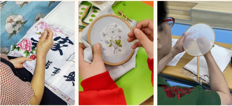 还有部分成员来到了老年大学,针对老年人开展了一次“刺绣文化”体验课堂,服务队成员们分发了刺绣材料包并现场教学指导刺绣技法,在整个过程中,成员们耐心地与老人进行交流沟通,在成员们的带动下,老年大学的员工们也不断上手感受刺绣的魅力。