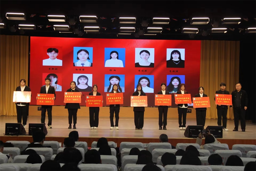 随后,主持人宣读获奖名单,颁奖仪式正式开始,由郭峰、赵勇、徐连荣、秦建波、郭玉真、郝翰、刘妙祎分别为国家奖学金和省政府奖学金、国家励志奖学金和省政府励志奖学金、省级及以上荣誉称号、英才奖学金、校级优秀员工干部、集体奖、校级单项奖学金颁发奖项。紧接着优秀员工代表丁振嘉、吴长乐、宋美璇依次上台发言,丁振嘉表示奖学金的设立不仅是一种荣誉,更寄托了公司和国家对老员工的殷切期望,也是同学们应当承担的一份责任和重托。吴长乐呼吁大家一起用实际行动来诠释人生价值。宋美璇作为优秀班集体代表发言,她带领班级取得了2023年度高校先进班集体的荣誉称号,她表示这份荣誉不仅是她们班级前进道路上的一个里程碑,也是一个新的起点。