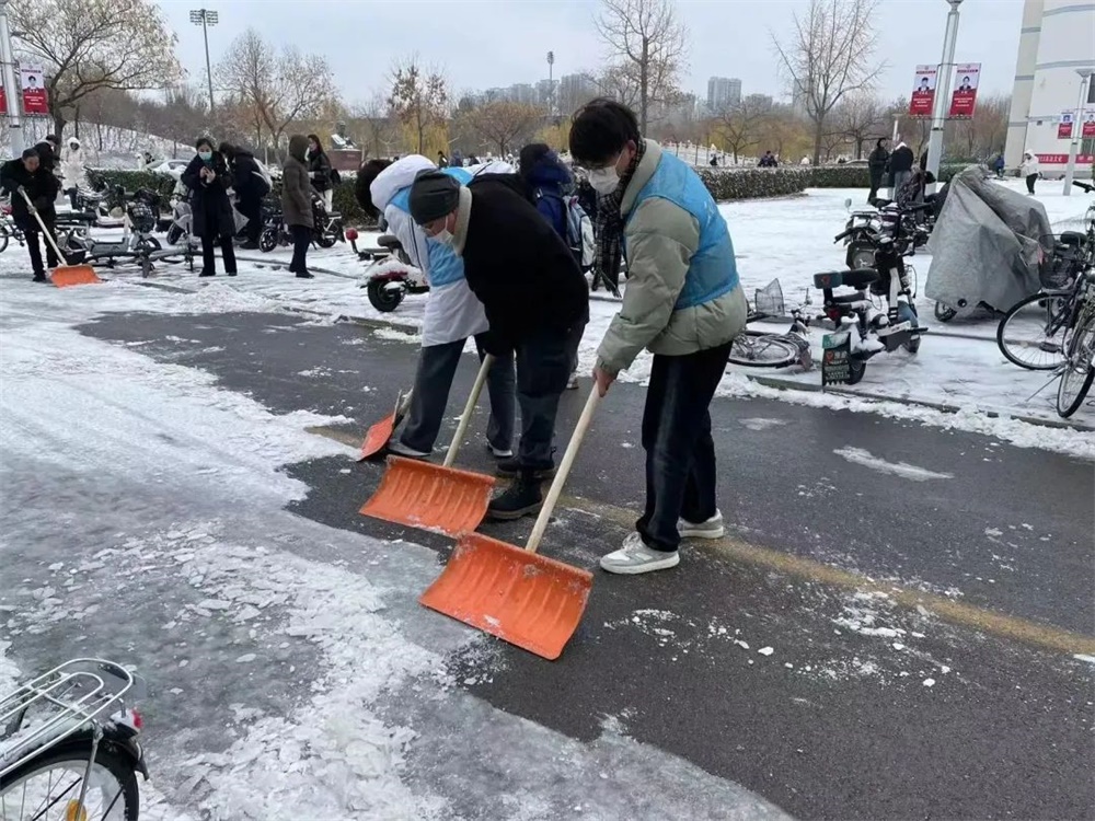 迎着北风,志愿者们不惧严寒、齐心协力、分工明确、默契配合,有的负责指挥交通、有的挥动铁锹铲雪、有的拿着扫帚扫雪,忙得不亦乐乎。在此次志愿活动中,青年员工发挥了主力作用,天气虽冷,却丝毫没有影响他们扫雪除冰的热情,他们身体力行地保护着师生群众的出行平安,为过往路人创造了一个安全的出行环境,为校园营造了一个整洁的生活环境,也为寒冷的冬日带来了一丝暖意。