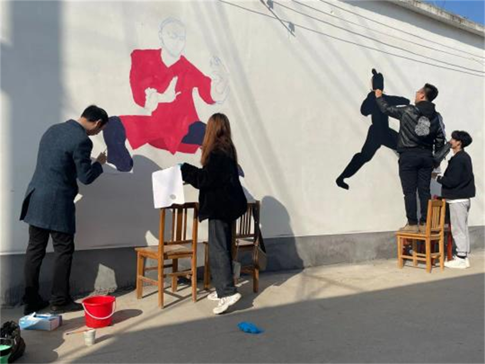 2021年11月12日,社团前往聊城市许营镇赵盘村开展“绘拳意少林,展风华青春”乡村墙绘活动,绘制非遗文化主题墙绘。