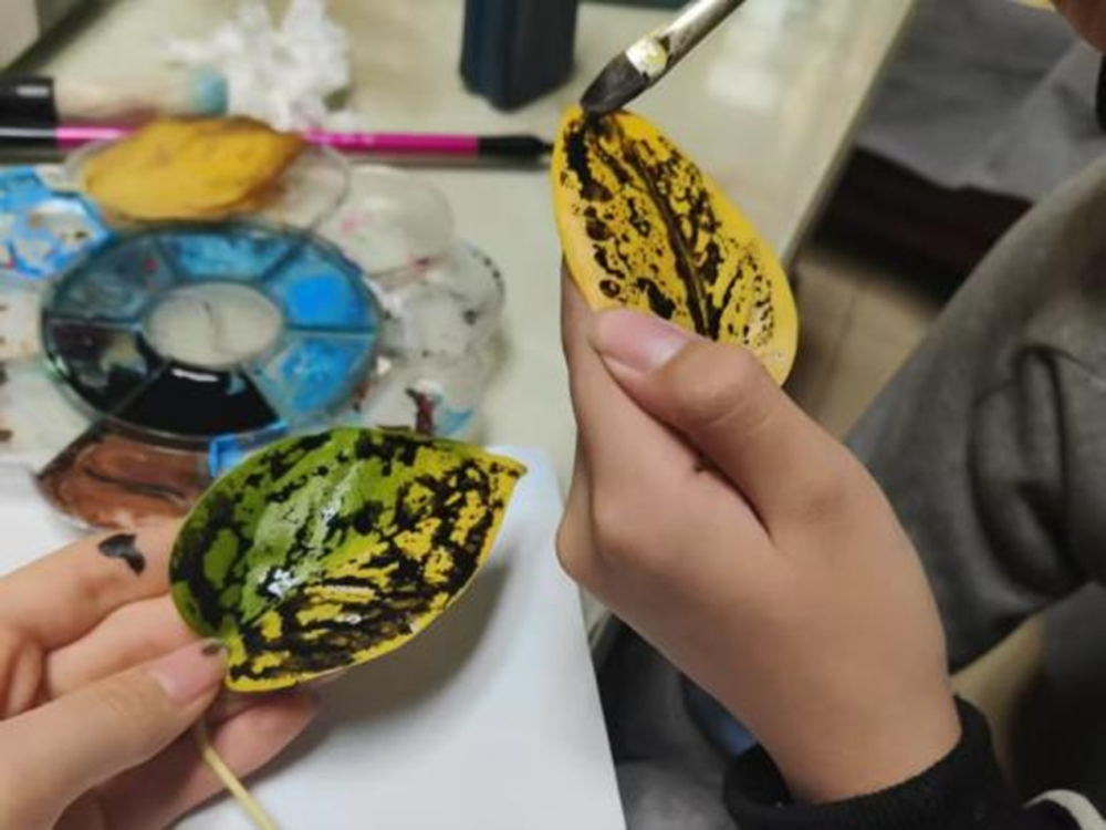 图9 同学与小朋友一同在树叶上绘画
