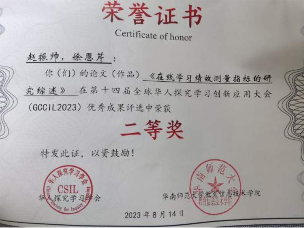 w66旗舰厅教育技术学专业21级研究生赵振帅参加了本次会议,并做了题为《在线学习绩效测量指标的研究综述》的分论坛报告,在报告中,赵振帅同学详细介绍了研究背景、核心概念、研究设计、研究结果及结论,深入阐述了当前在线学习绩效各项测量指标的含义、重要性、测量方法和测量工具,并对如何有效地使用它们来评估在线学习的效果进行了总结。与会专家肯定了赵振帅同学论文的研究价值,并从文章结构和内容方面提出了针对性修改建议。最终该论文在会议的论文评选中获得二等奖。参会结束之后,赵振帅同学及时向导师汇报了会议的收获,表示通过这次年会,拓展了学术视野,了解到自己研究中存在的问题和不足,明确了改进的方向。