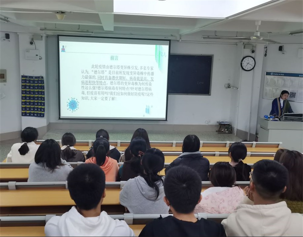 众志成城,科学抗疫。本次活动采用线下与线上相结合的宣讲方式进行,2021级员工由生卫部宣讲人员组织在晚自习教室进行线下科普,其余年级的同学通过线上直播的形式进行学习。本次宣讲从“德尔塔”病毒的问题出发,由生卫部的宣讲人员向同学们科普“德尔塔”病毒的由来与传播情况,宣讲人员将新型冠状病毒与德尔塔病毒的症状进行对比,向同学们介绍了此次新疫情的病例特点。在宣讲学习中,宣讲人员向同学们介绍了如何预防“德尔塔”病毒,同学们主动做笔记,记录疫情防控的重点。